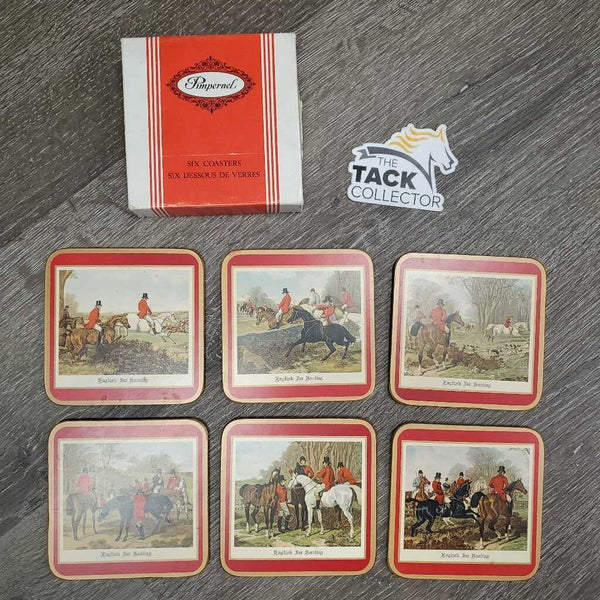 VINTAGE 6 Cork "English Fox Hunting" Coasters, box *vgc, mnr stains, gunk & scratches Pimpernel Size: 4 x 4 $28.00