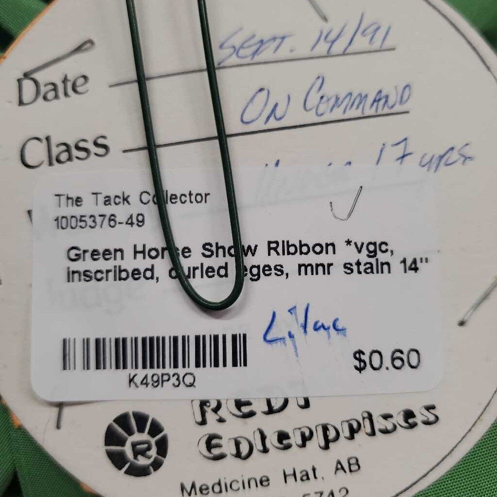 Green Horse Show Ribbon *vgc, inscribed, curled eges, mnr stain