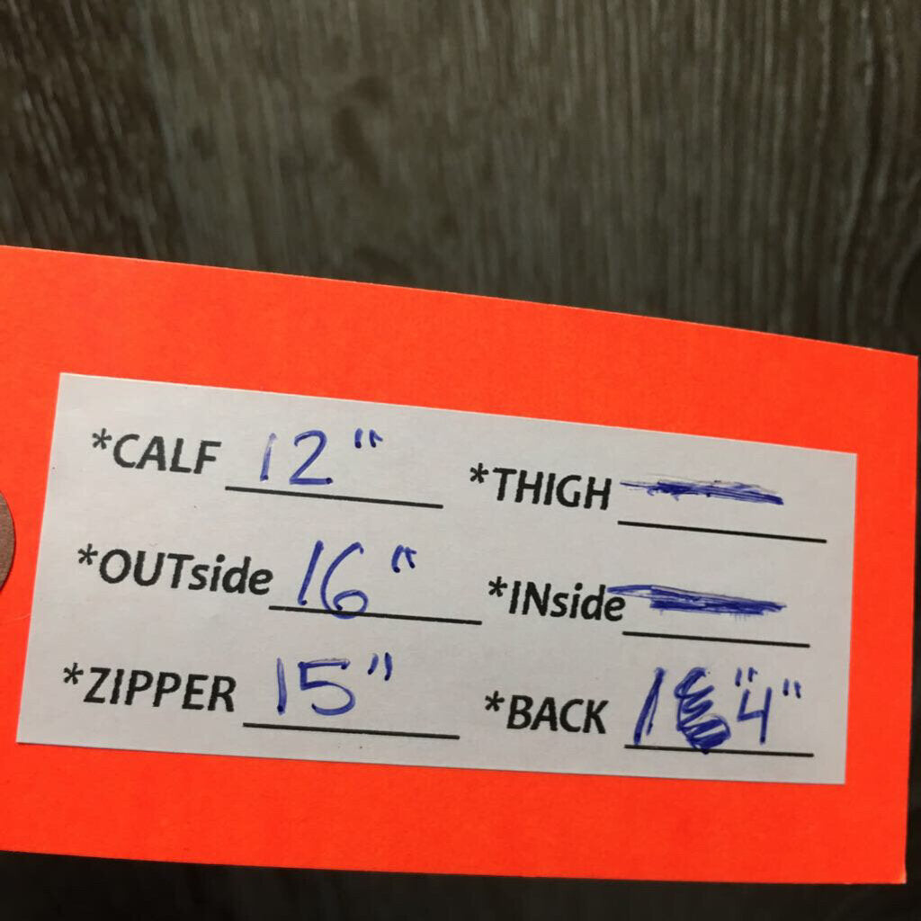 Calf: 12", Outside: 16", Zipper: 15", Back: 14" *Gently brush off sand and soil and clean with a damp sponge. Dry with a soft cloth and that's it! Always store in a dry and ventilated place. Do not leave these boots near a heat source (radiator or fire). For faster drying, hang boots upside down.