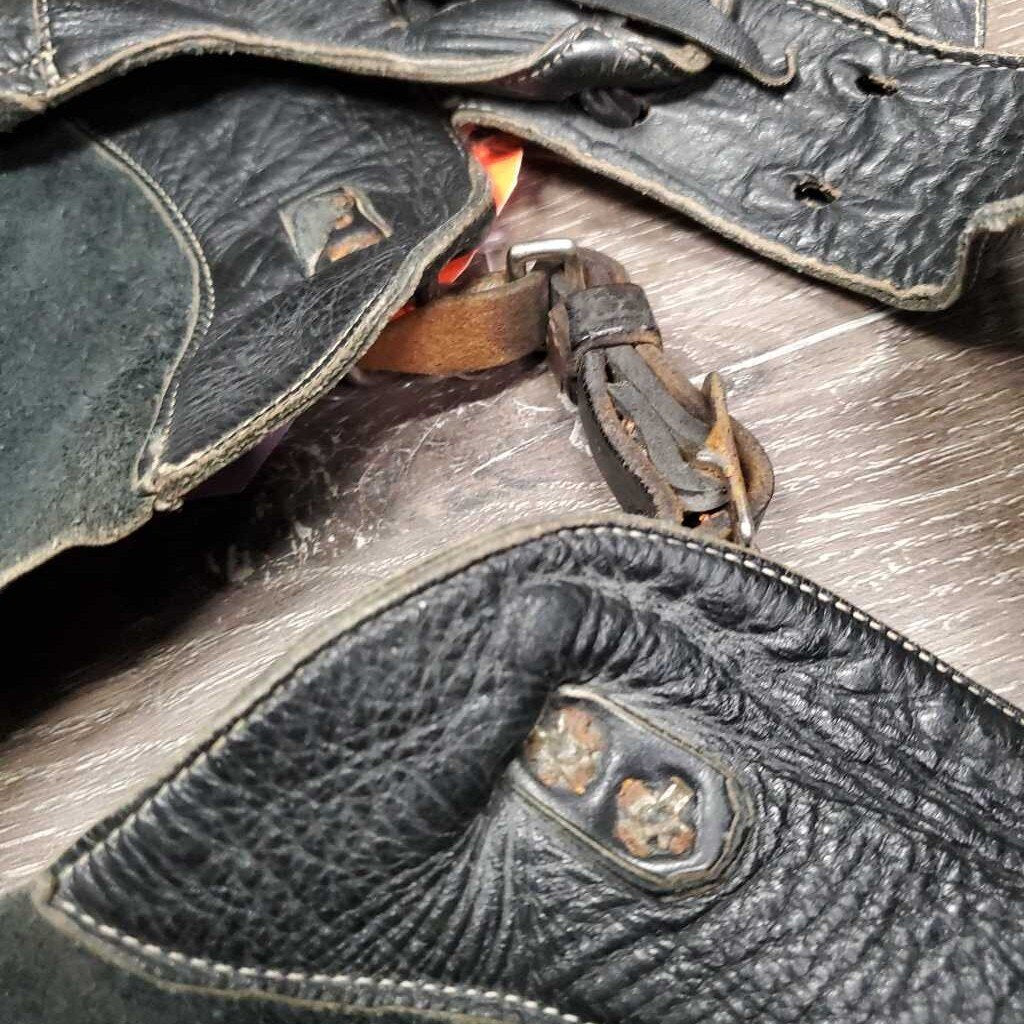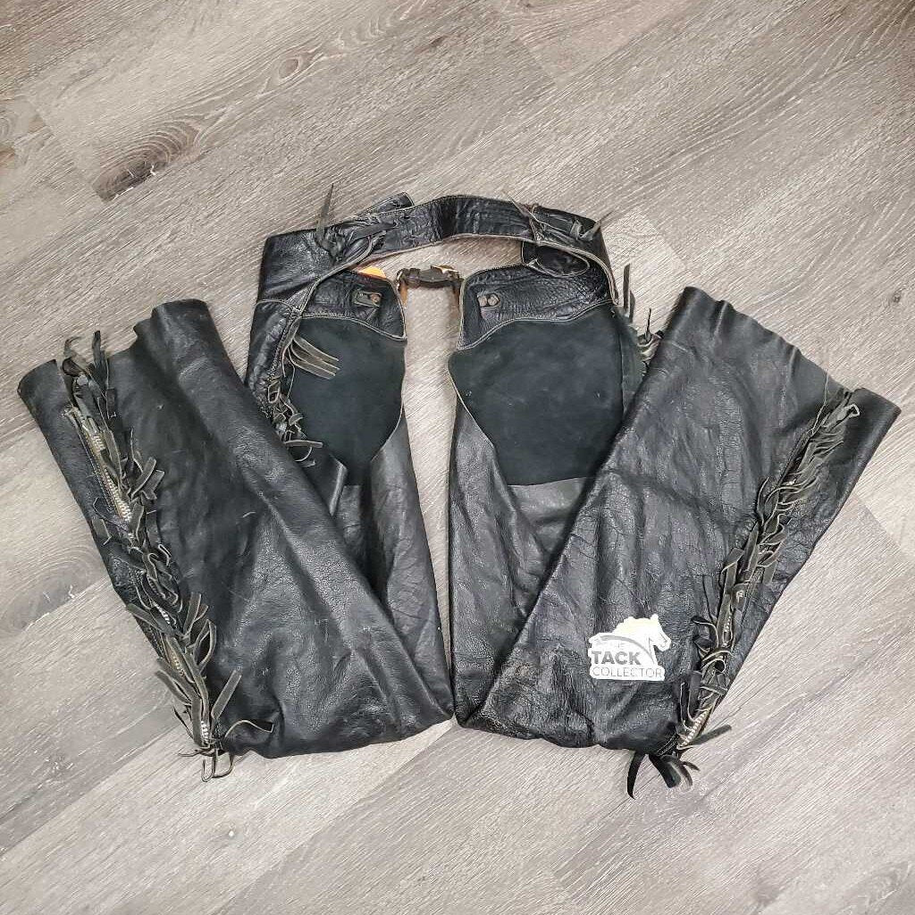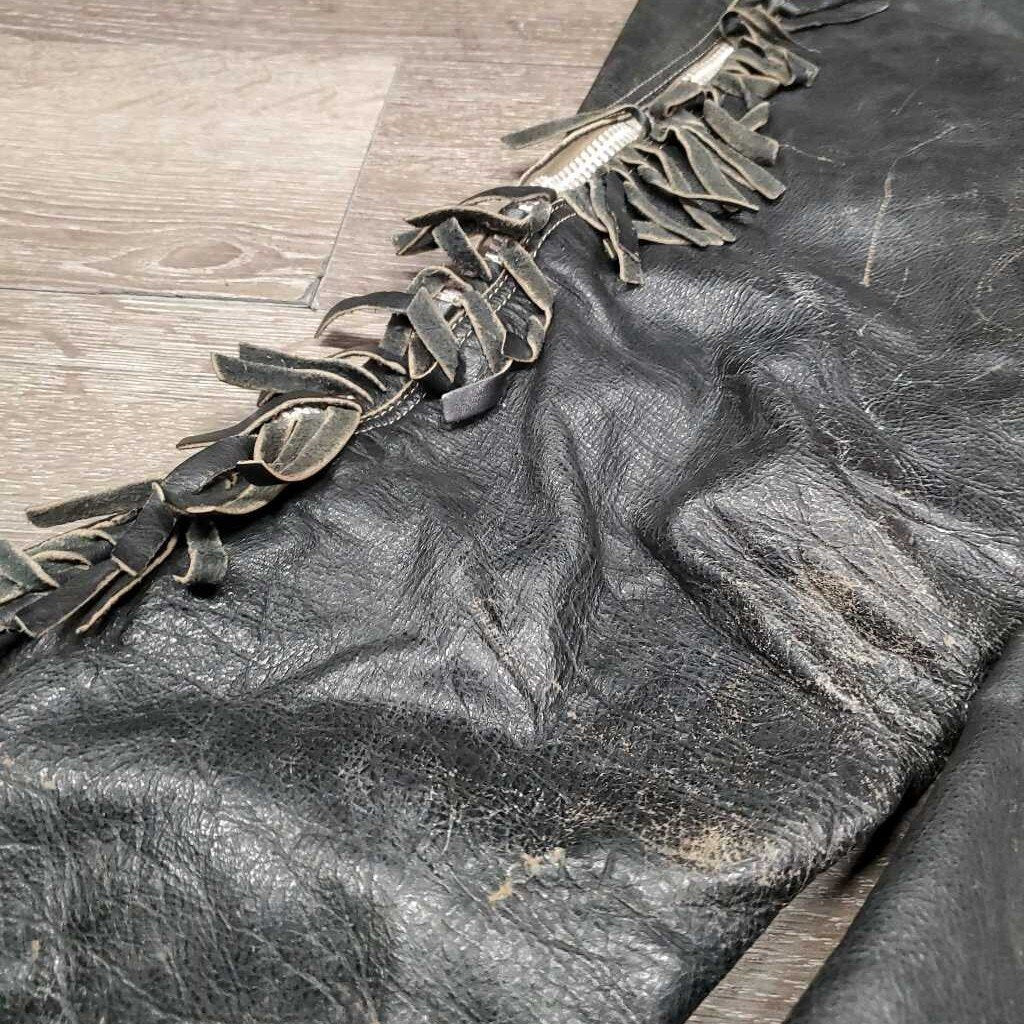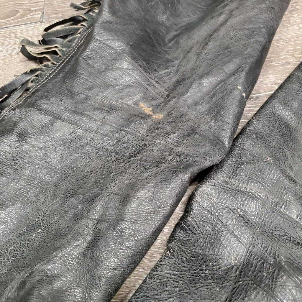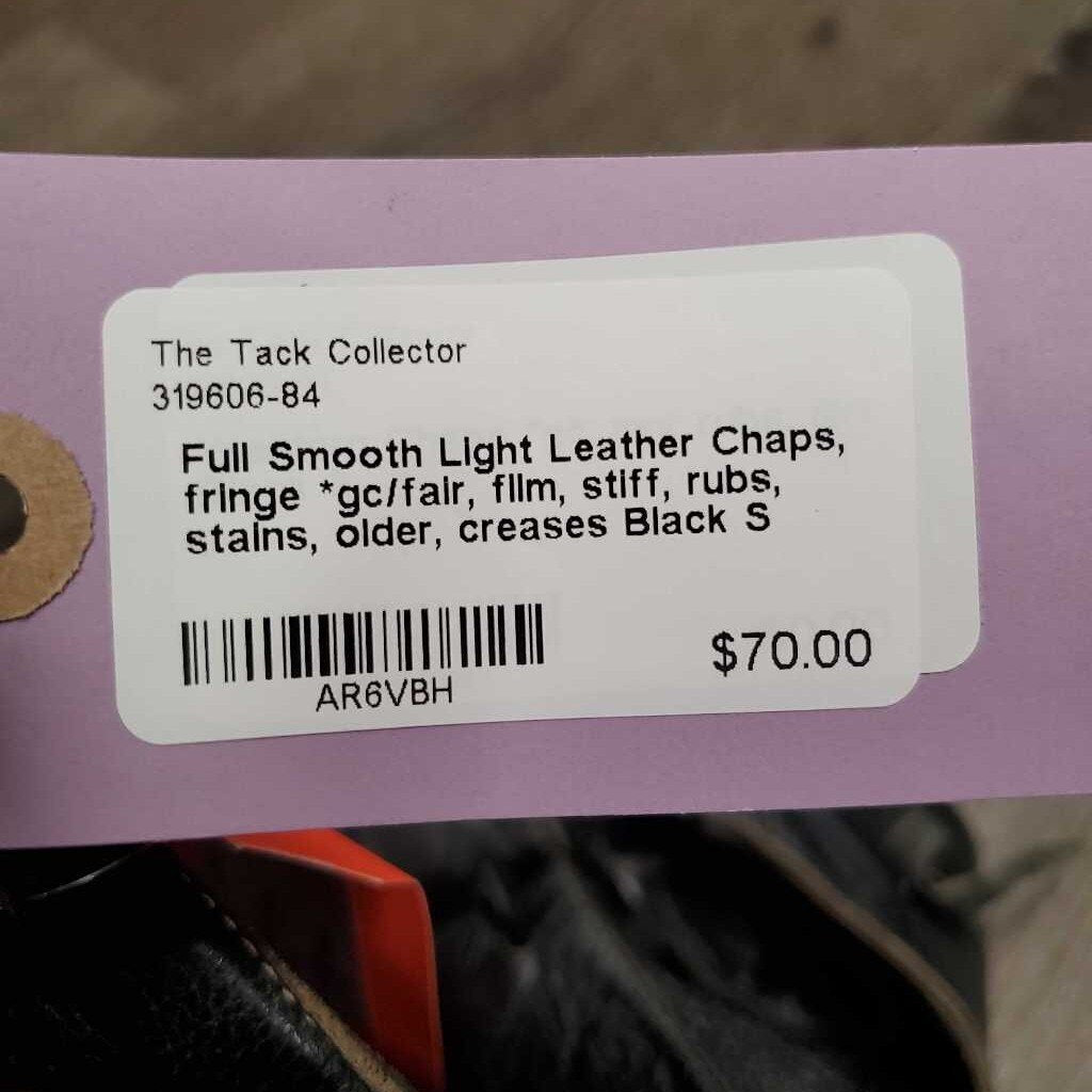 Full Smooth Light Leather Chaps, fringe *gc/fair, film, stiff, rubs, stains, older, creases