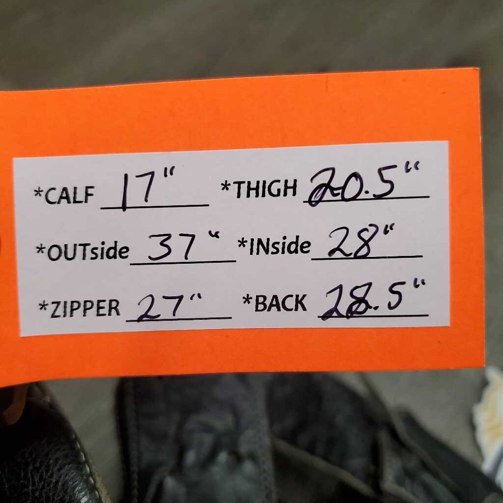 Calf 17", Outside 37", Zipper 27", Thigh 20.5", Inside 28", Back 28.5"