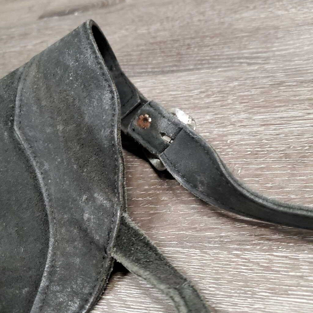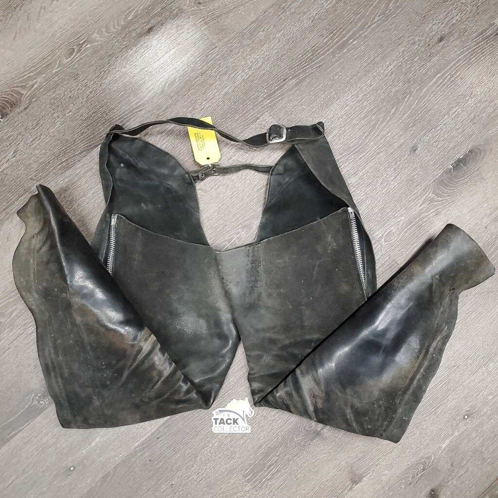 Full Suede Chaps, zips *fair, dirty, older, v.stiff & curled bottom, rubs, discolored