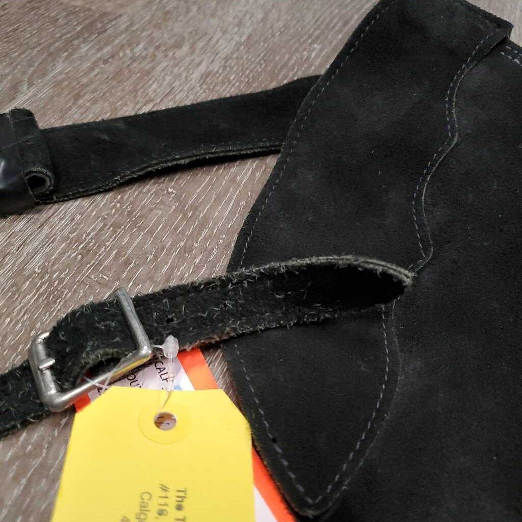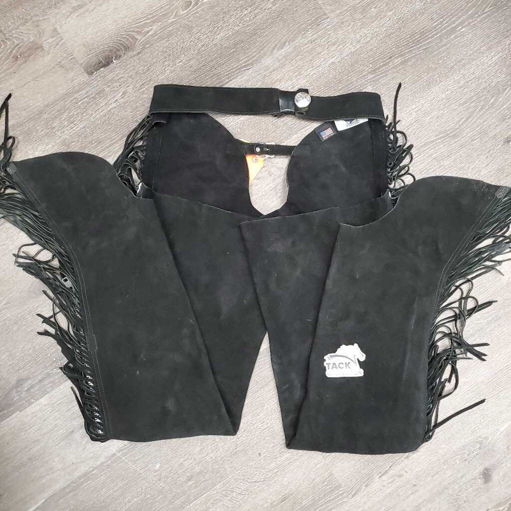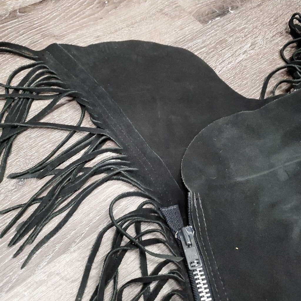 Hvy Suede Full Show Chaps, Fringe, Concho *xc/vgc, mnr dirt & rubs, folded & tapped waist