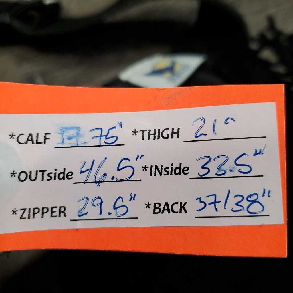 Calf: 17.75", Thigh: 21", Outside: 46.5", Inside: 33.5", Zipper: 29.5", Back: 37/38" *these are Beautiful :)