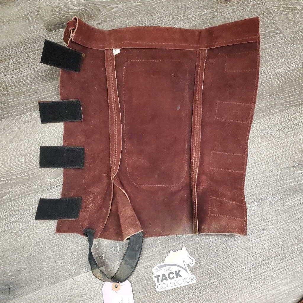 Hvy Suede Half Chaps, velcro closures, Top Buckle Strap *vgc, older, mnr dirt, stretched els, threads, faded