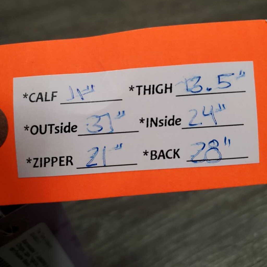 Calf: 11", Thigh: 13.5", Outside: 31", Inside: 24", Zipper: 21", Back: 28"