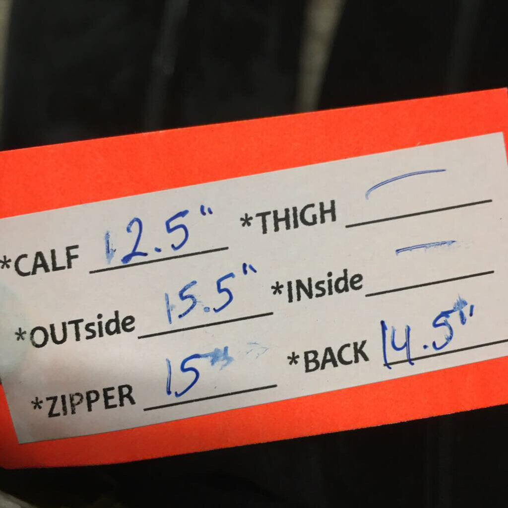 Calf 12.5", Out 15.5", Zip 15", Back 14.5"