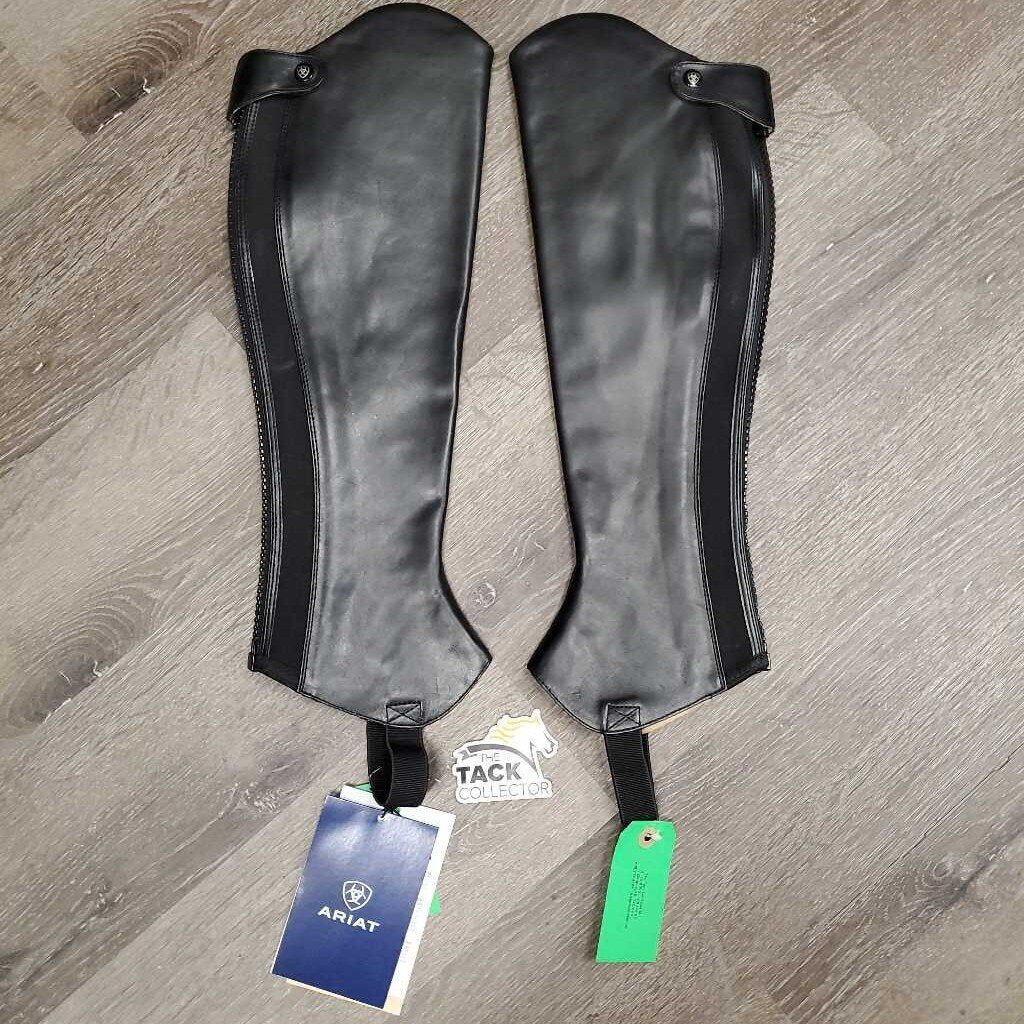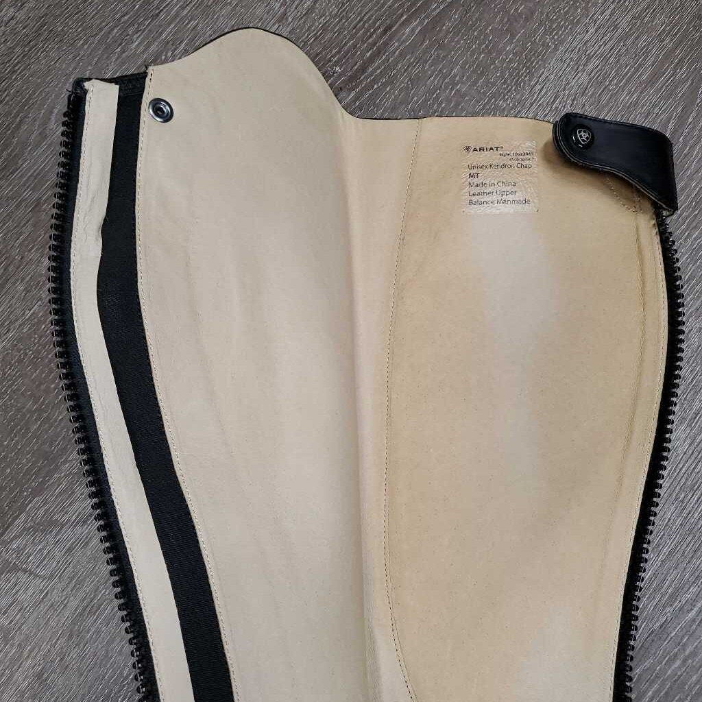 Calf: 13.75", Outside: 20", Zipper: 16.5", Back: 17.5" Soft, unisex chaps work with the Kendron paddock boots to create an elegant look. An elastic gore provides a glove-like fit. Premium calf leather Full-grain leather lining Oiled leather inner calf panel Full-length gore panel on lateral side High Spanish-cut topline Mobility curve Full-length YKK® back zipper with keeper Leather skirt over instep