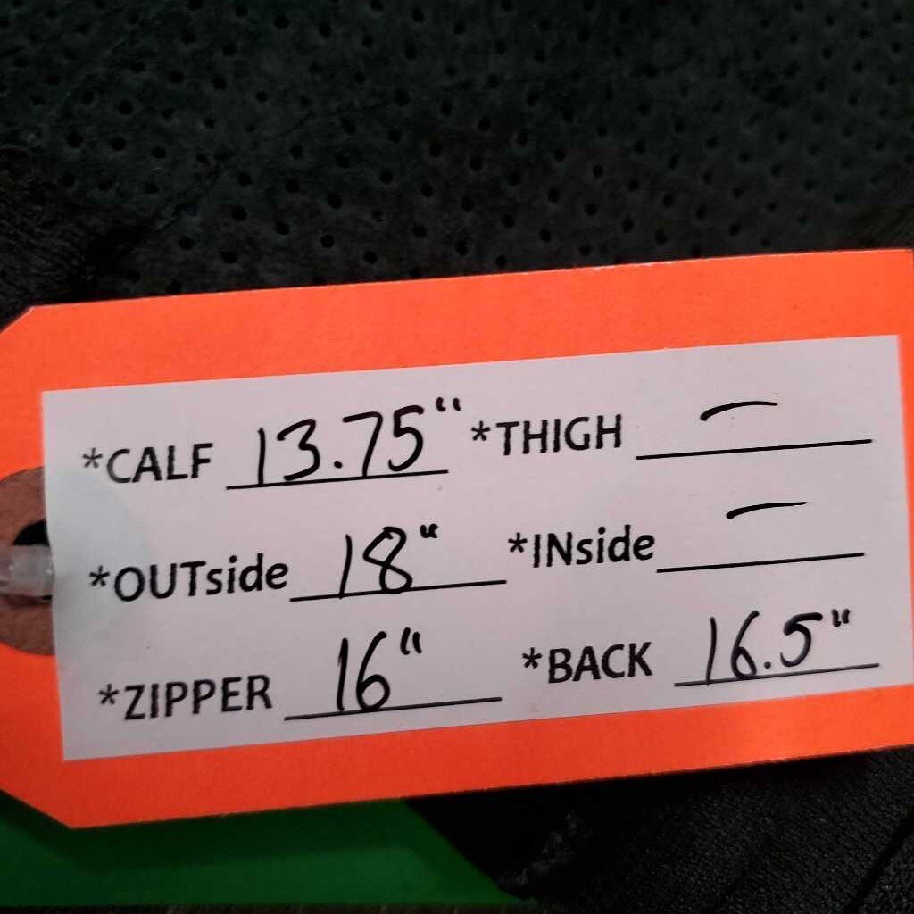 Calf 13.75", Outside 18", Zipper 16", Back 16.5"