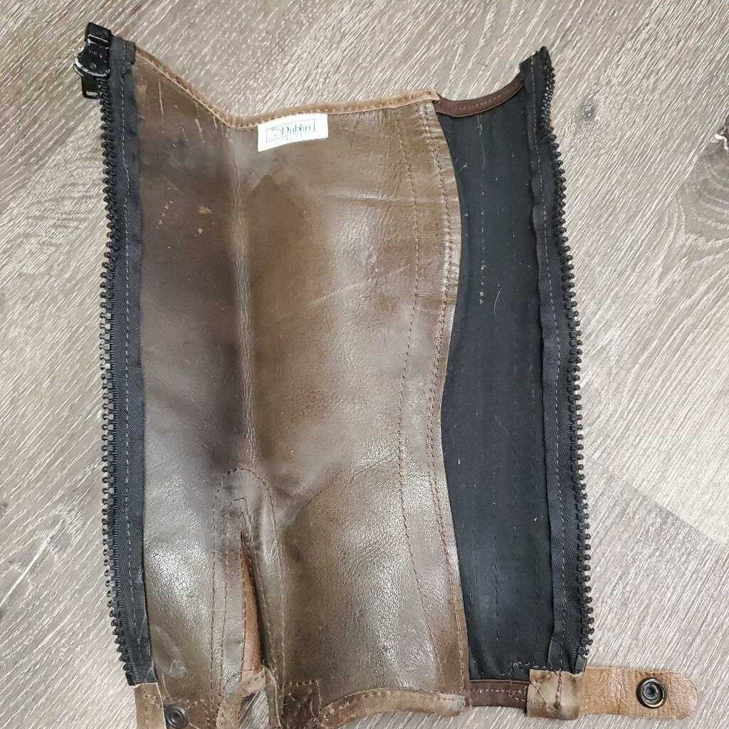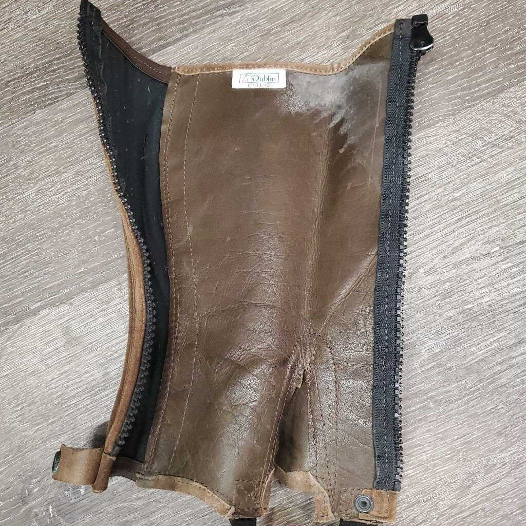 Pr JUNIORS Hvy Suede Half Chaps *gc, rubs, stains, mnr residue & unstiched seams, rips
