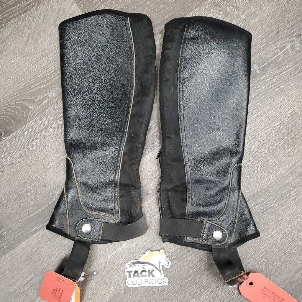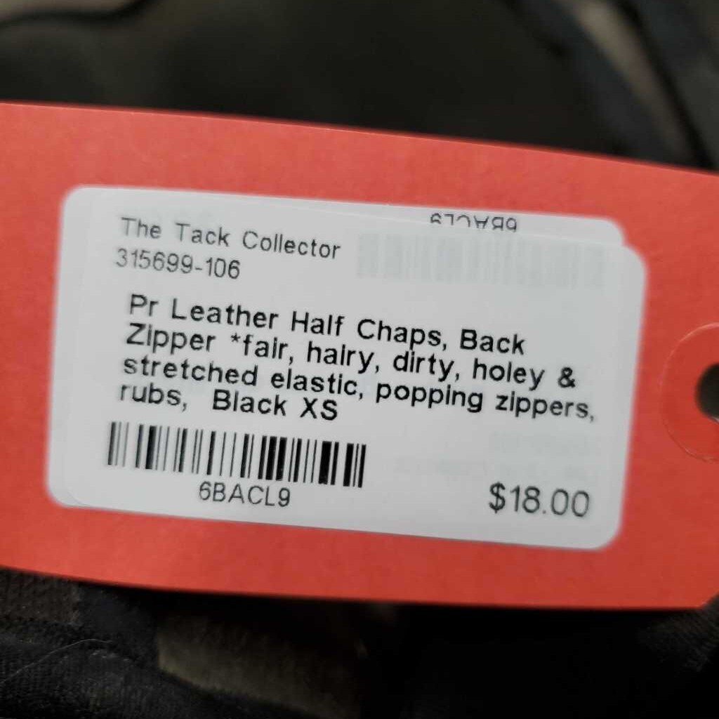 Pr Leather Half Chaps, Back Zipper *fair, hairy, dirty, holey & stretched elastic, popping zippers, rubs