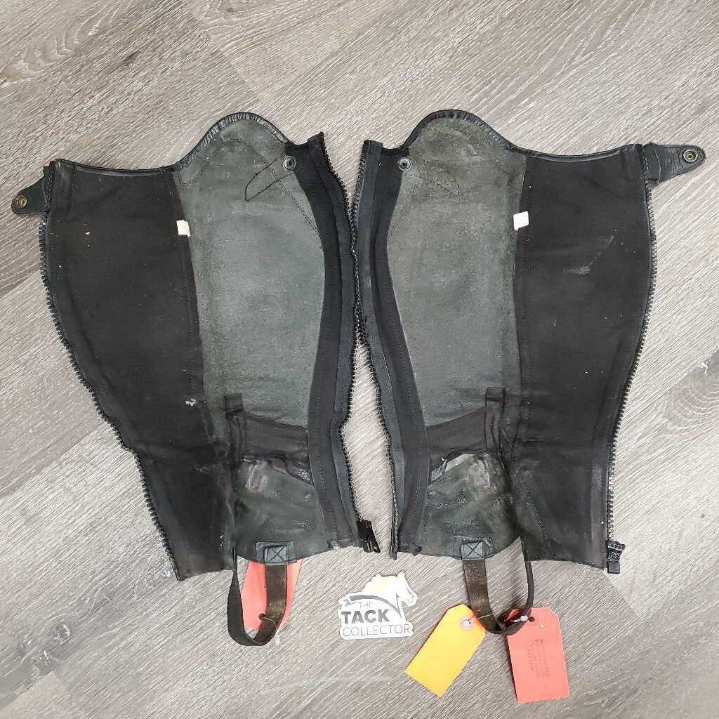 Pr Leather Half Chaps, Back Zips *gc, clean, mnr dirt?residue, mnr stretched top elastic, lining: pulled & curled, rubs, sm holes
