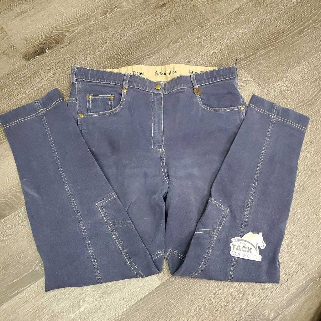 Euro Seat Denim Breeches *gc, older?, seam puckers, mnr loose thread, pulled seat seam, faded