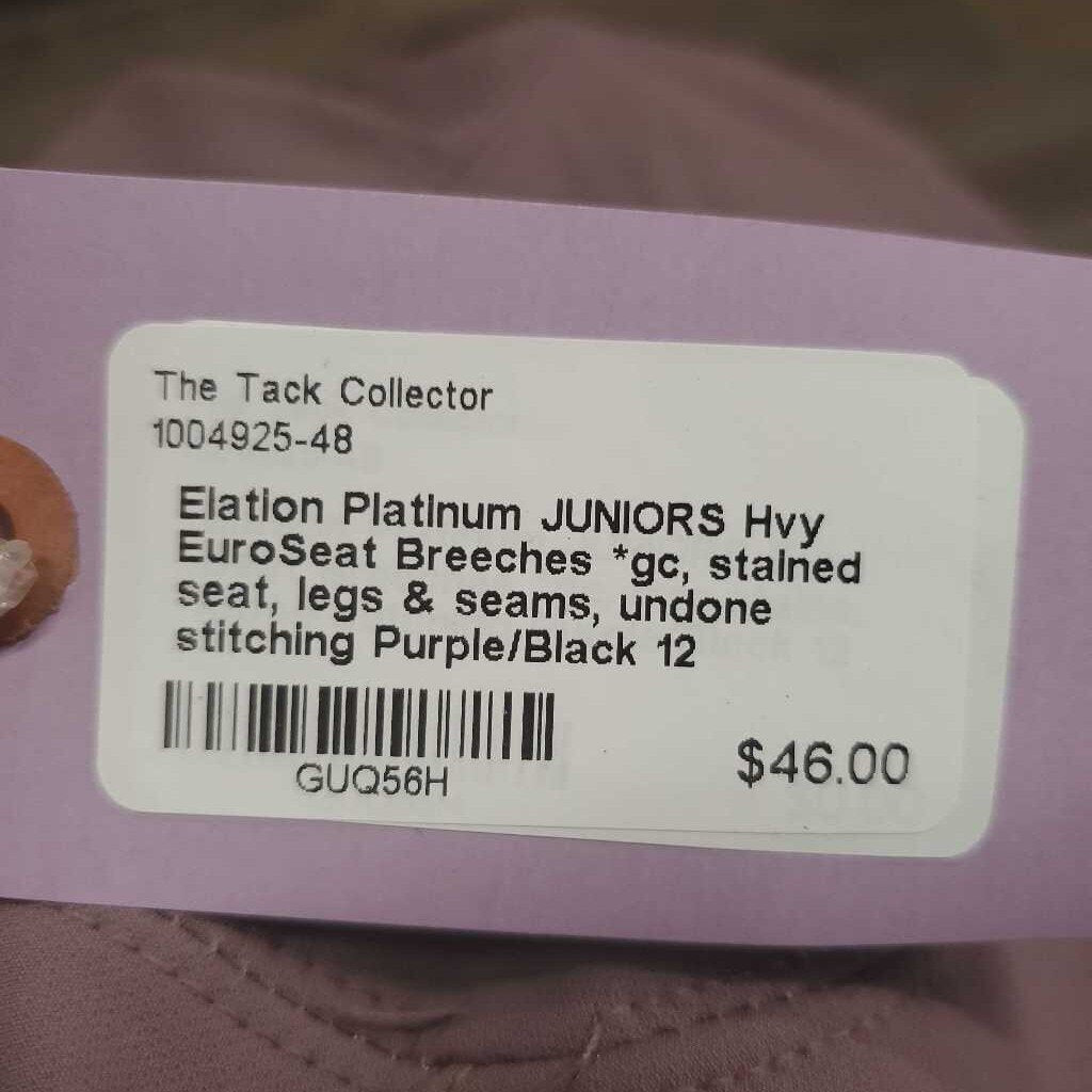 JUNIORS Hvy EuroSeat Breeches *gc, stained seat, legs & seams, undone stitching