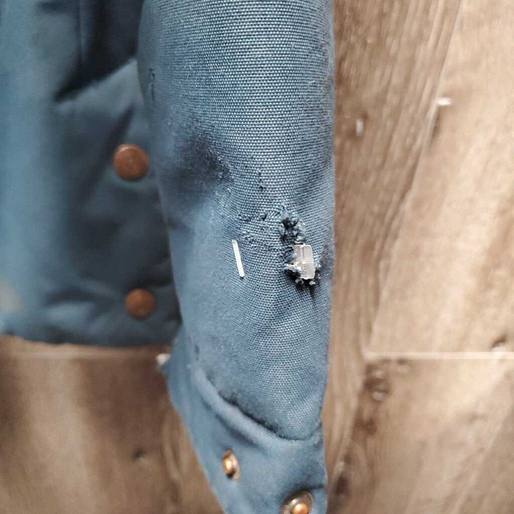 Canvas Fleece Lined Winter Jacket, Zipper & Snaps, hood *gc, faded, v.clumpy & hairy lining, unstitched cuff, rip, cuff stains