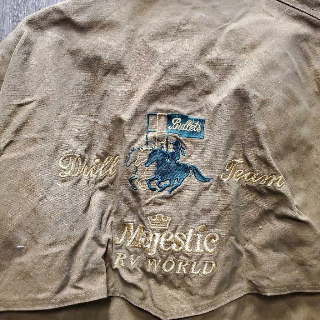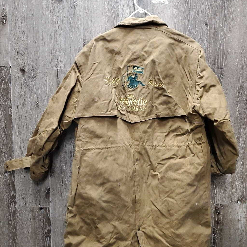 Full Length Oil Skin Coat "Bullets Drill Team" *gc, older, dirt, stains, residue, pulled sleeve lining, v.stiff, puckered & discolored collar
