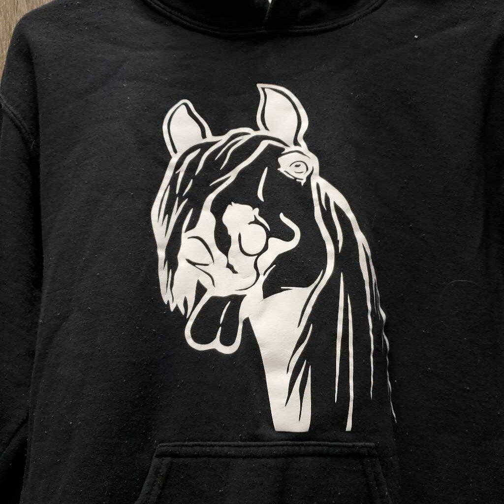 Thick Hvy Sweatshirt Hoodie "Horse Head" *gc, faded, v.pilly, clumpy lining