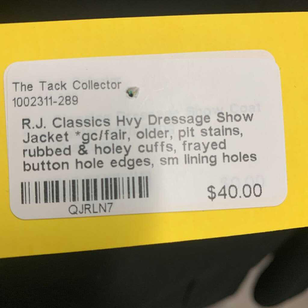 Hvy Dressage Show Jacket *gc/fair, older, pit stains, rubbed & holey cuffs, frayed button hole edges, sm lining holes
