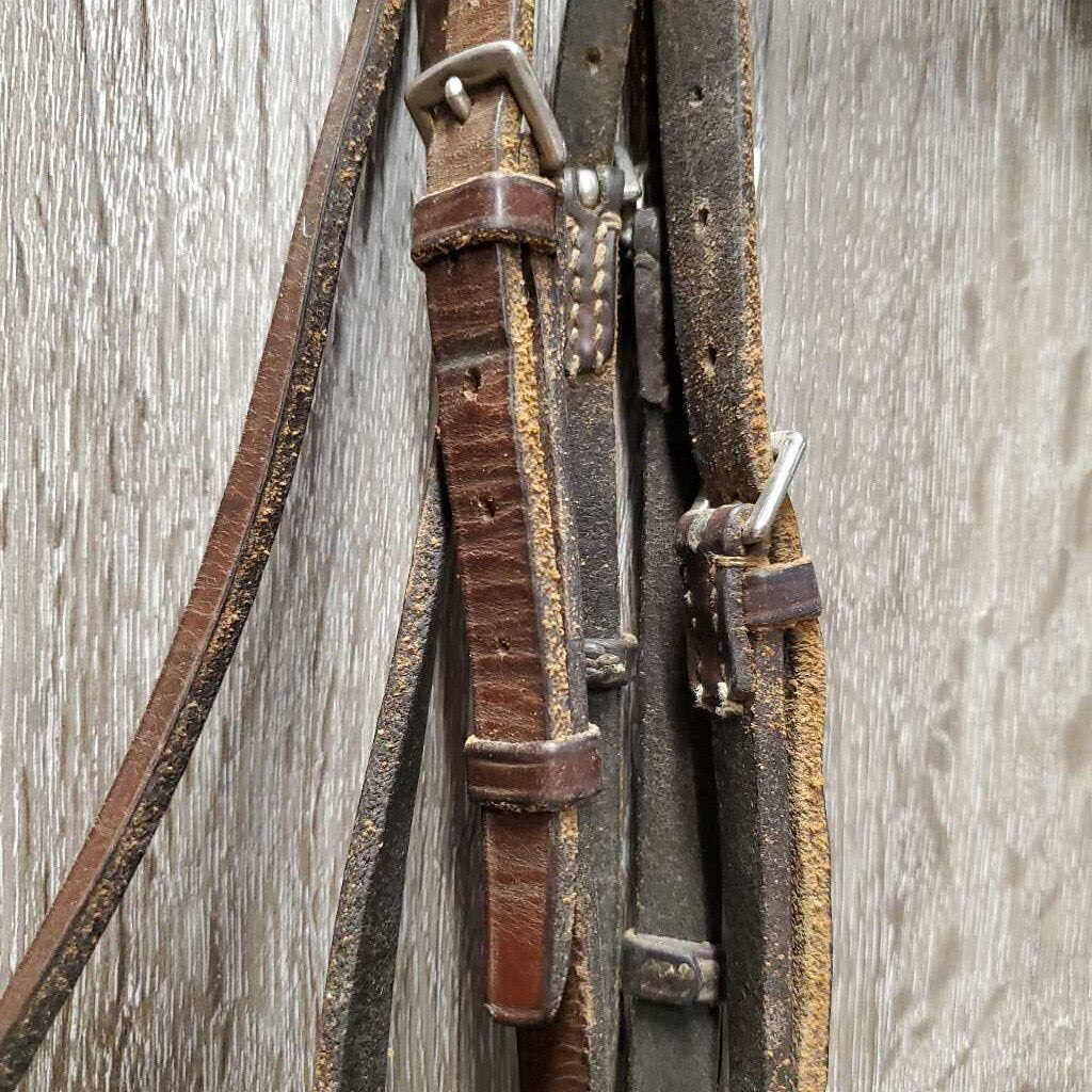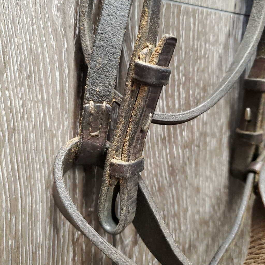 Flat Leather Bridle, Braided Reins *gc/fair, dry, stiff, older, rubs, residue, stains, scrapes