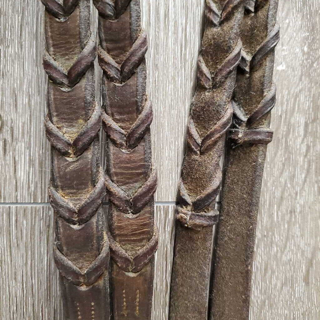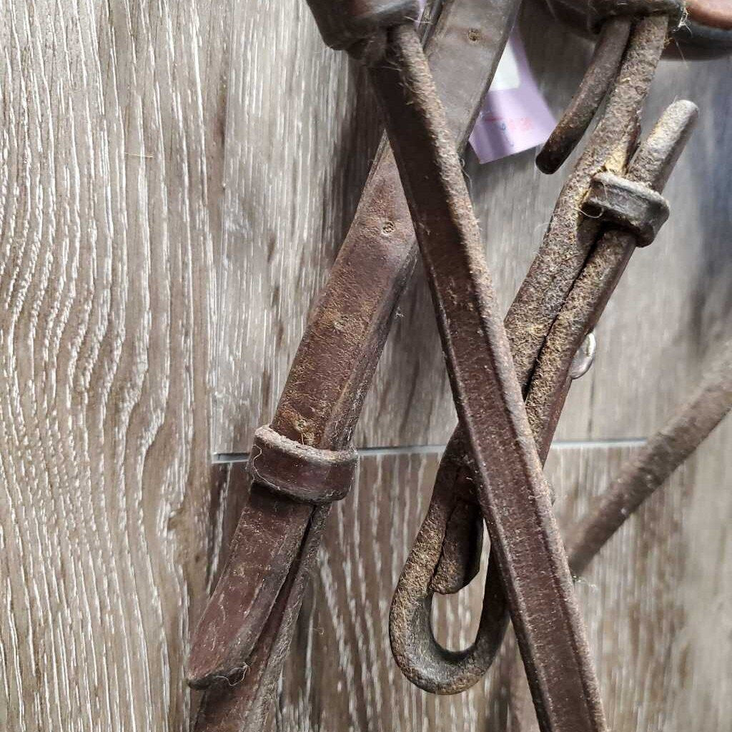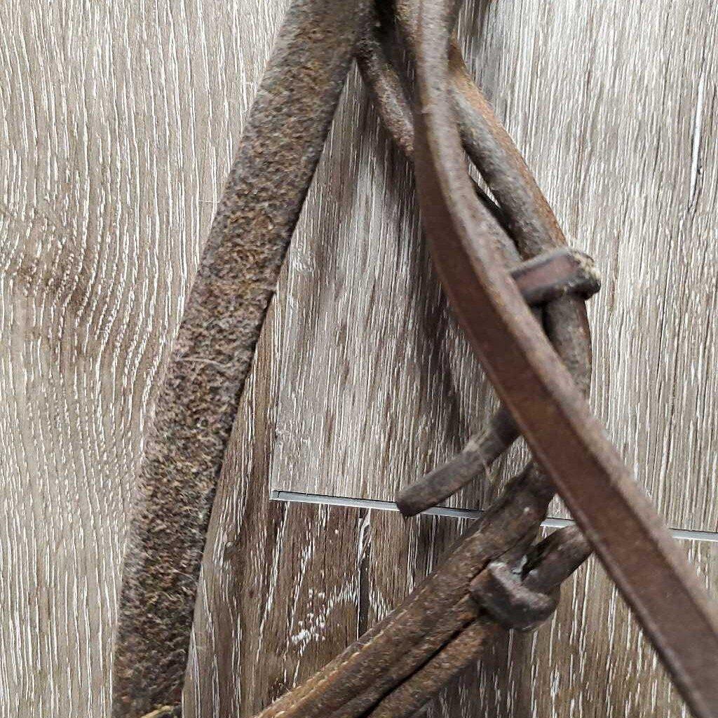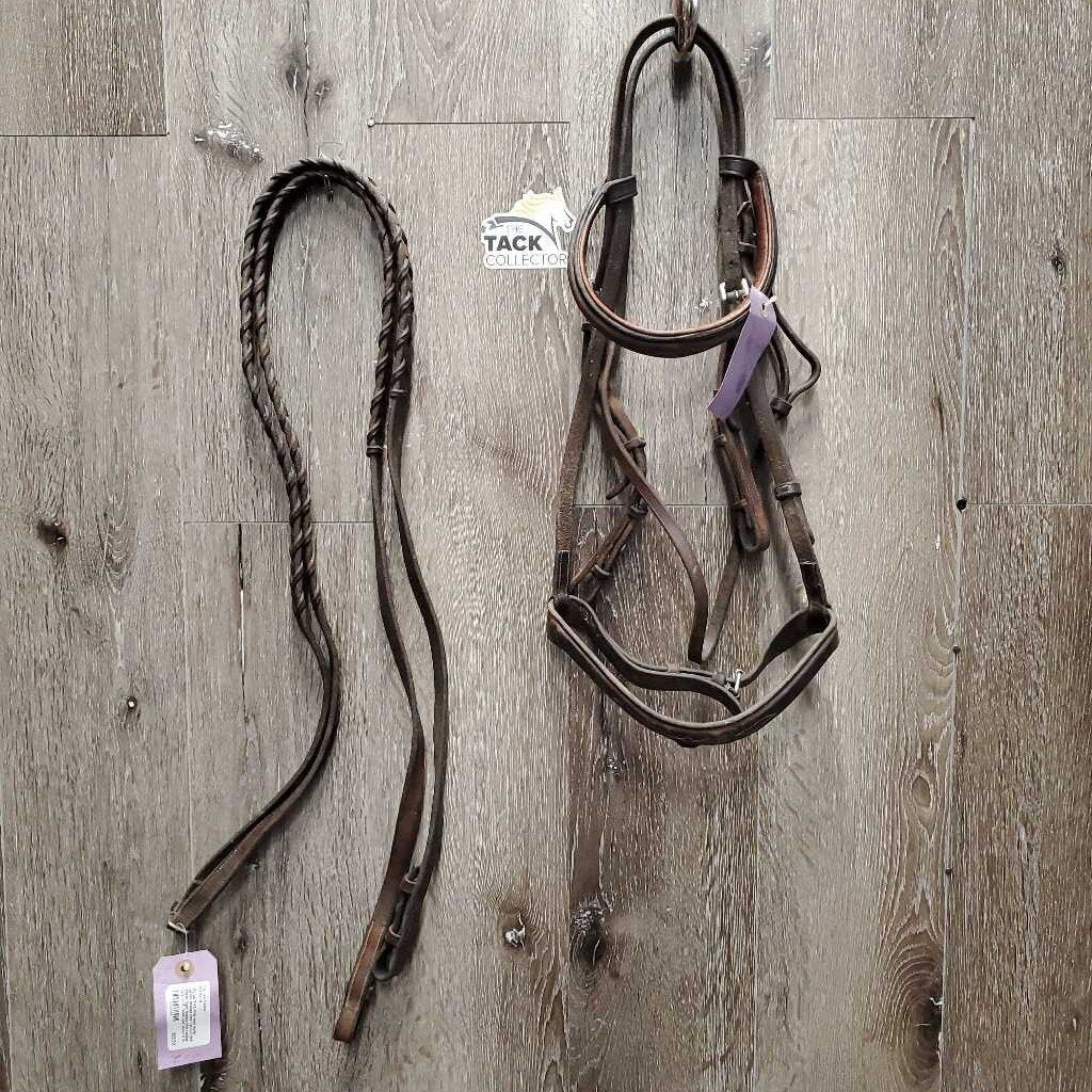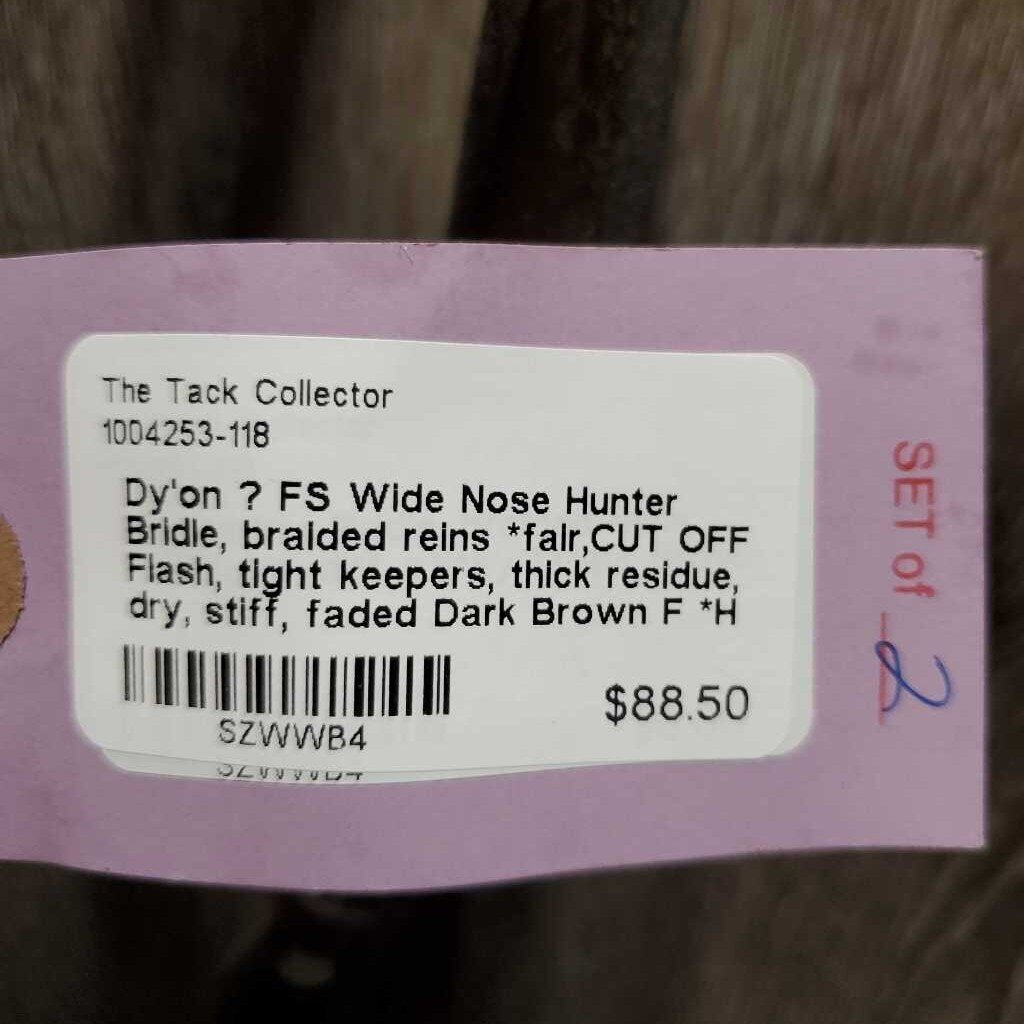 FS Wide Nose Hunter Bridle, braided reins *fair,CUT OFF Flash, tight keepers, thick residue, dry, stiff, faded