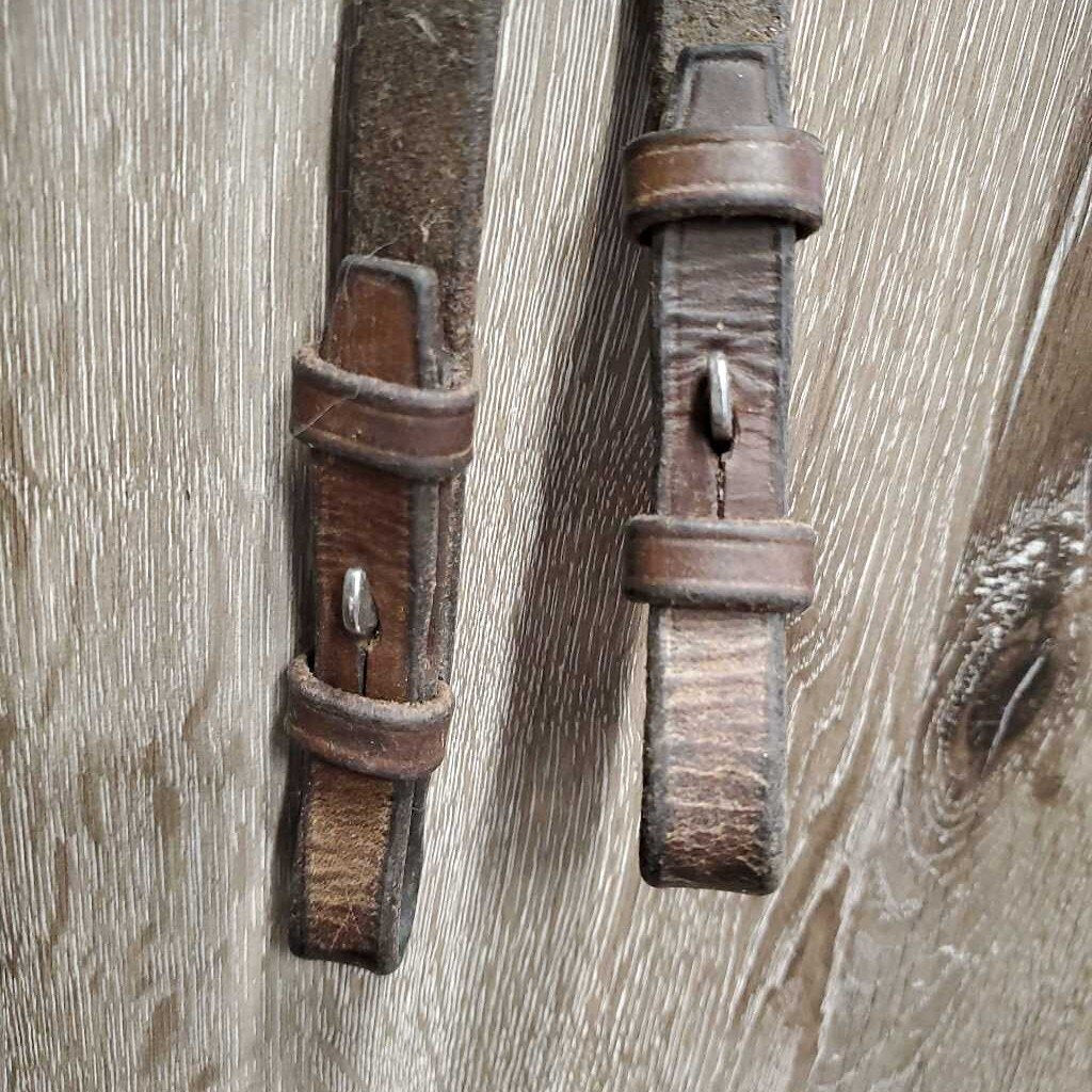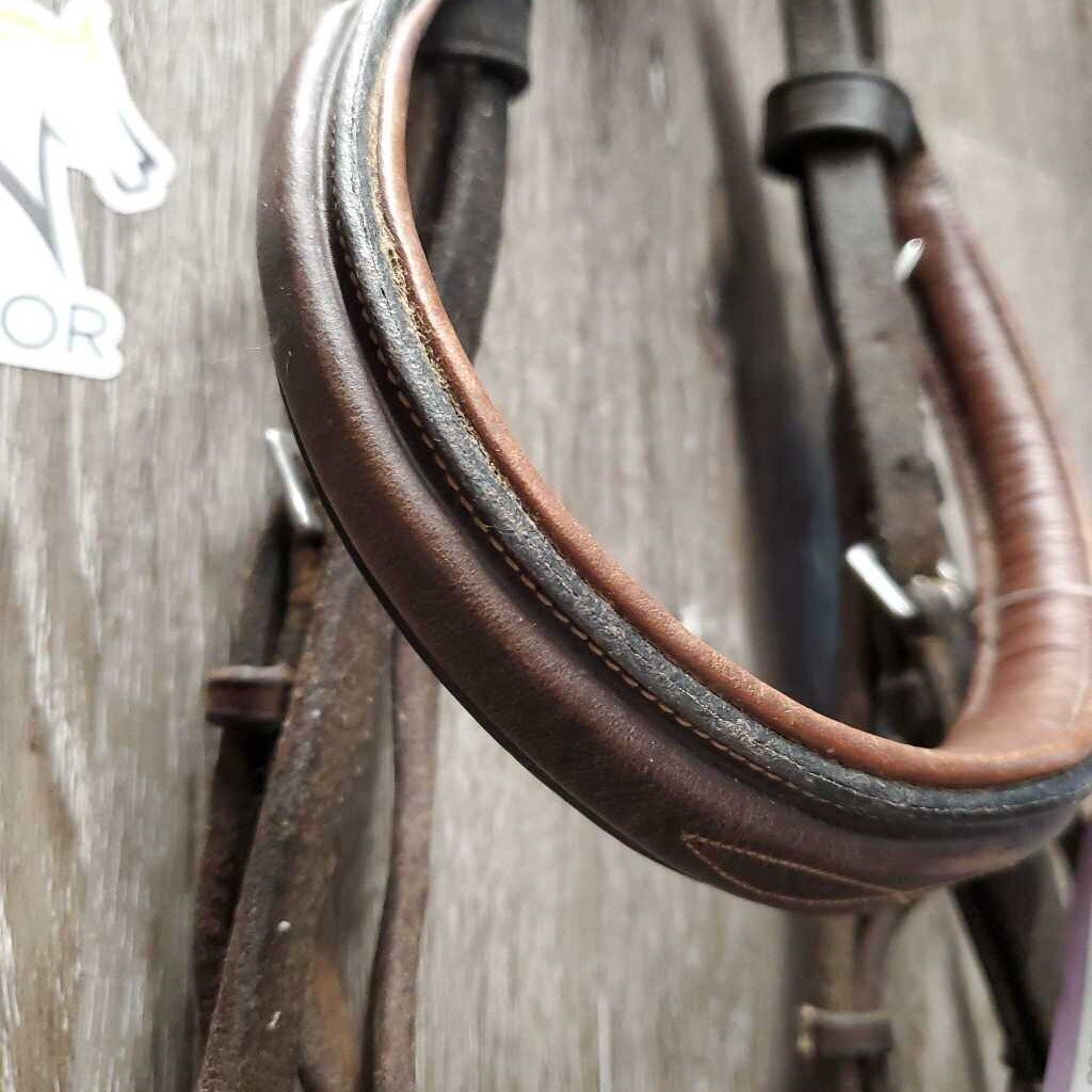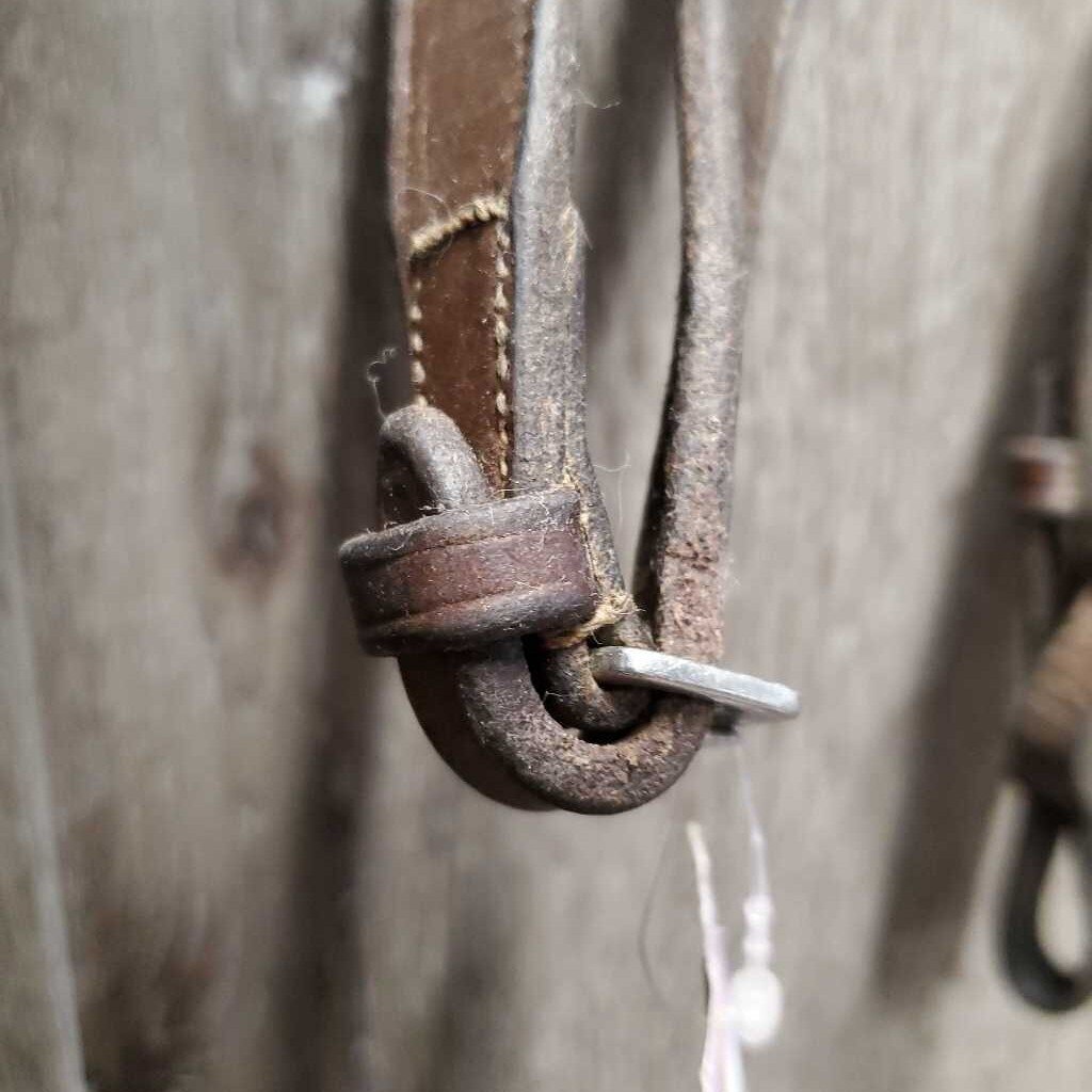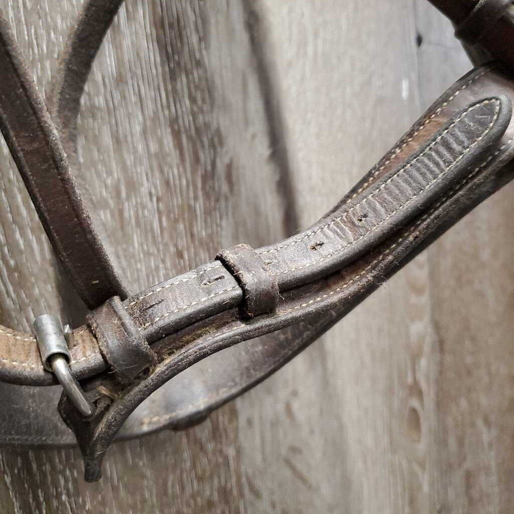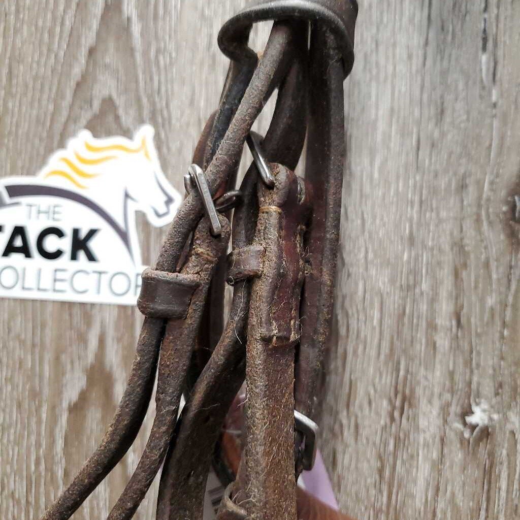 FS Wide Nose Hunter Bridle, braided reins *fair,CUT OFF Flash, tight keepers, thick residue, dry, stiff, faded