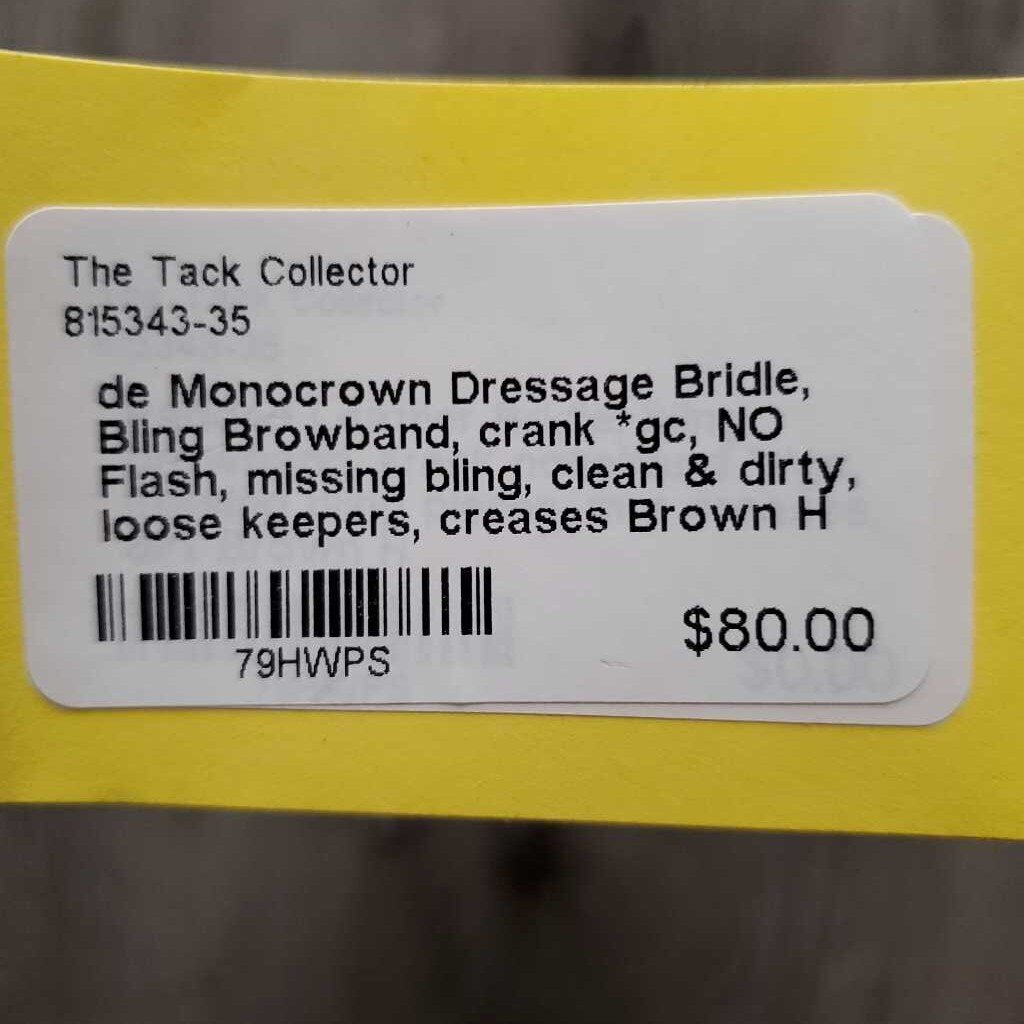 Monocrown Dressage Bridle, Bling Browband, crank *gc, NO Flash, missing bling, clean & dirty, loose keepers, creases