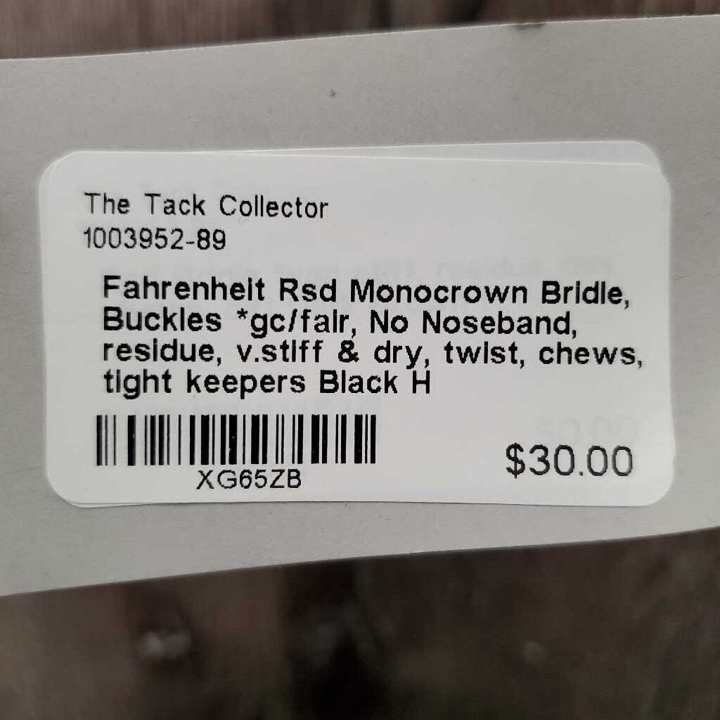 Rsd Monocrown Bridle, Buckles *gc/fair, No Noseband, residue, v.stiff & dry, twist, chews, tight keepers