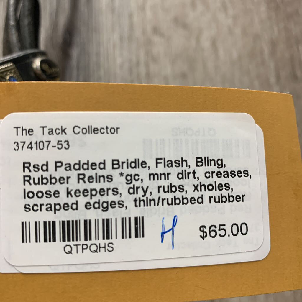 Rsd Padded Bridle, Flash, Bling, Rubber Reins *gc, mnr dirt, creases, loose keepers, dry, rubs, xholes, scraped edges, thin/rubbed rubber