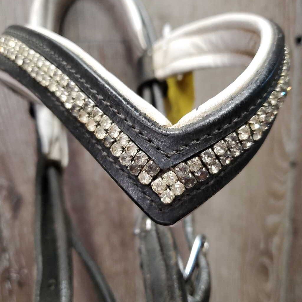 Rsd Padded Monocrown Dressage Bridle, Crank, Bling *gc, NO Flash, seam stains?dirt, v.tight keeper, mnr residue, rubs, discolored bling, dry, stiff, xholes, cut end