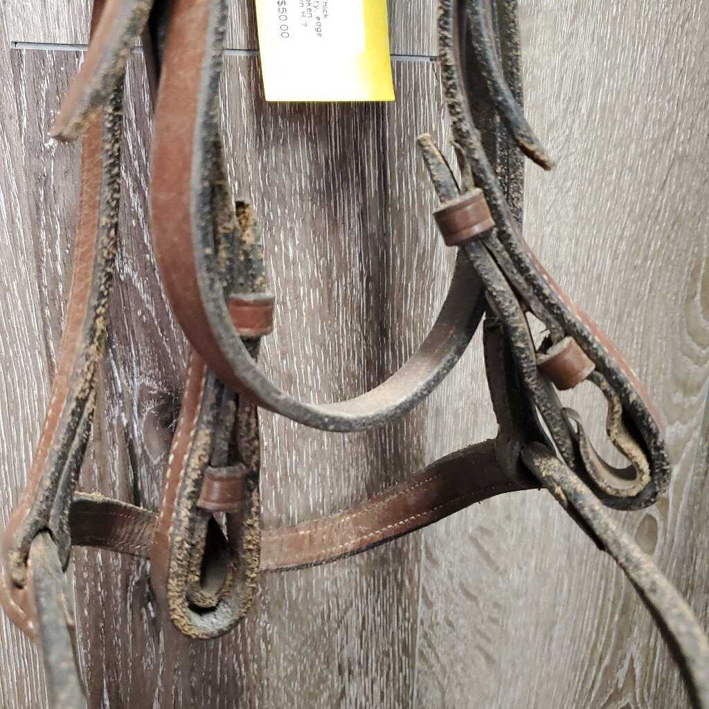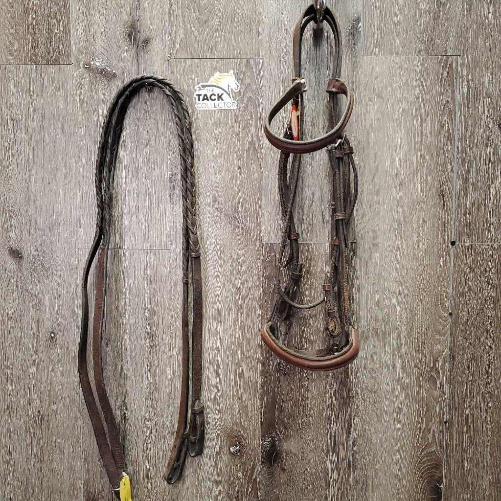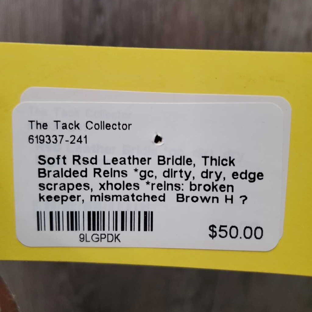 Soft Rsd Leather Bridle, Thick Braided Reins *gc, dirty, dry, edge scrapes, xholes *reins: broken keeper, mismatched