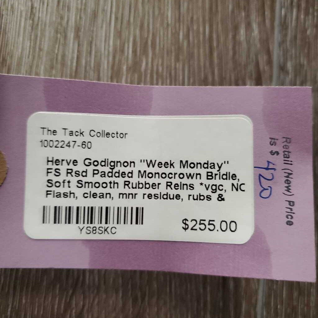 "Week Monday" FS Rsd Padded Monocrown Bridle, Soft Smooth Rubber Reins *vgc, NO Flash, clean, mnr residue, rubs & stretched hole