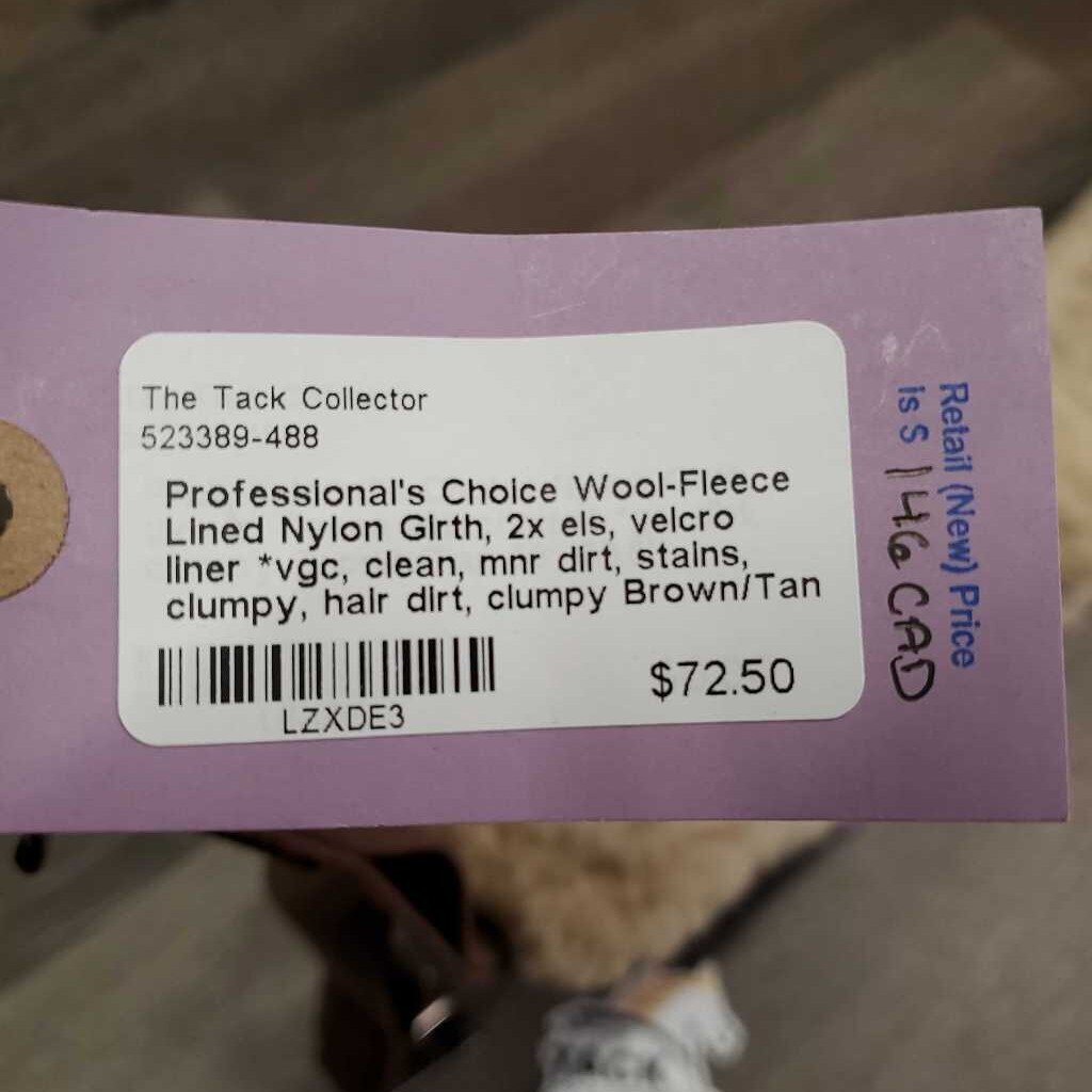 Wool-Fleece Lined Nylon Girth, 2x els, velcro liner *vgc, clean, mnr dirt, stains, clumpy, hair dirt, clumpy