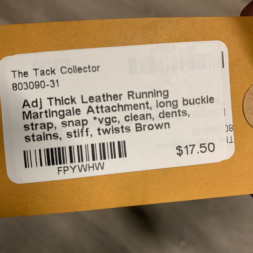 Adj Thick Leather Running Martingale Attachment, long buckle strap, snap *vgc, clean, dents, stains, stiff, twists