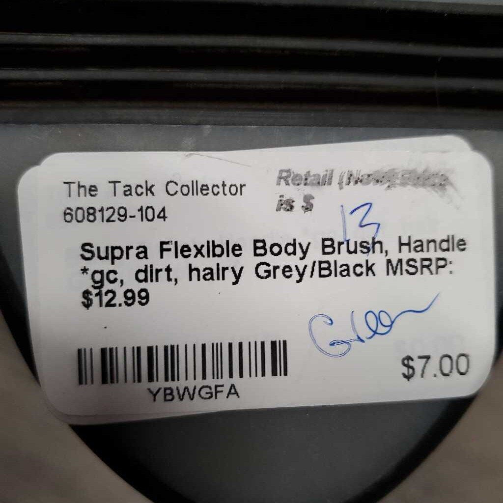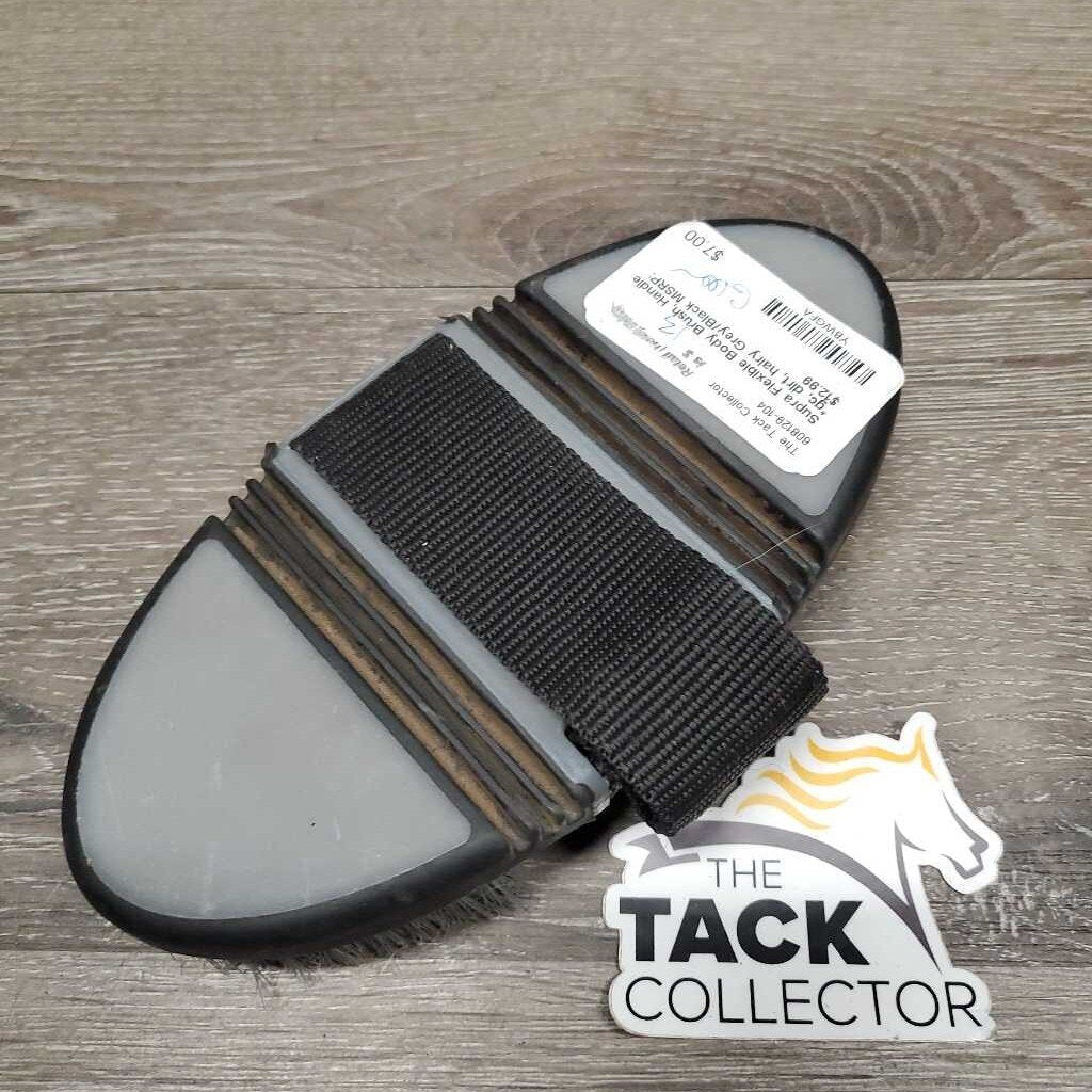 Body brushes are used to help remove finer particles and dust from the horse's coat while helping to add shine to the body. Body brushes are often softer than dandy brushes, allowing them to be used all over the body, including the legs. The Supra Soft Touch Flexi Brush features an ergonomic design that flexes to conform to your hand during brushing for comfort and effectiveness. Complete with a striped bristle design and nylon hand strap.