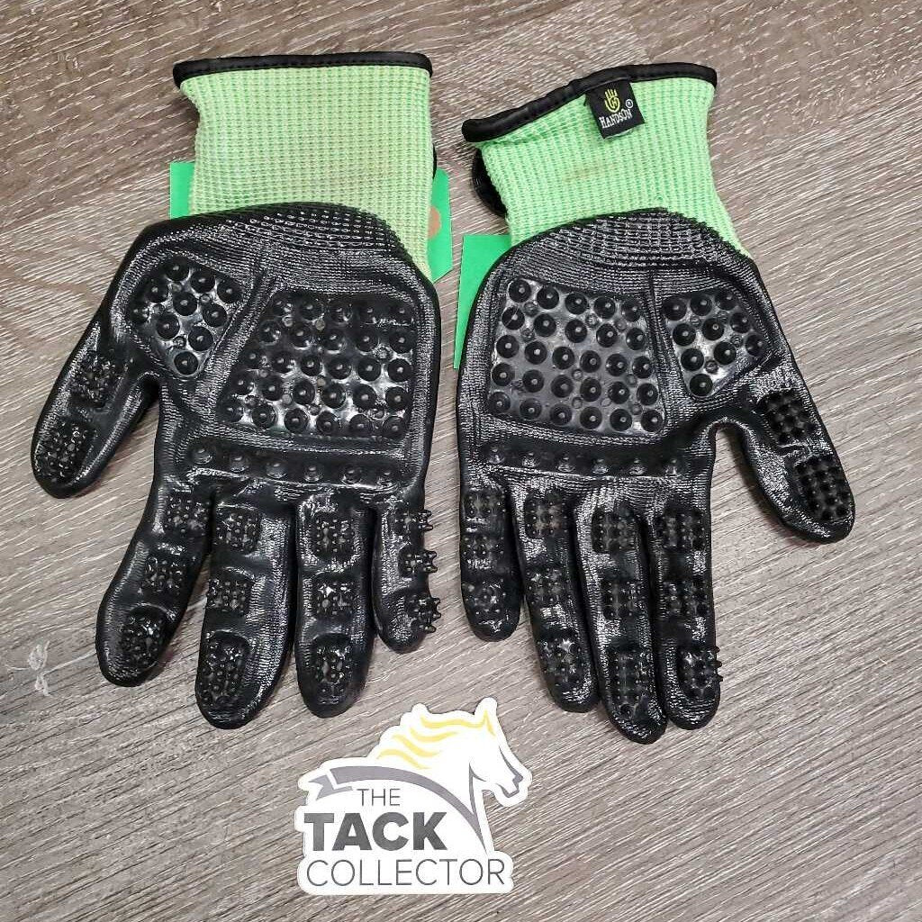 Lightweight grooming gloves feature scrubbing nodules on the fingers and palms to provide a deep, thorough clean and also function as a shedding or bathing tool. Hair easily slips off the glove; just a simple flick of the wrist and the hair instantly releases so you can go right back to caring for your animal. The textured surface and flexibility of the gloves allow you to better massage and help improve circulation while distributing natural oils and promoting a healthy skin and coat. Your gloves will not slip or fall off even when wet and soapy. Keep your hands, fingernails, and horse clean! Lightweight grooming, shedding, and bathing gloves Scrubbing nodules on the fingers and palms Hair easily slips off the glove Massage and help improve circulation Help distribute natural oils Will not slip or fall off even when wet and soapy Keep your hands, fingernails, and horse clean