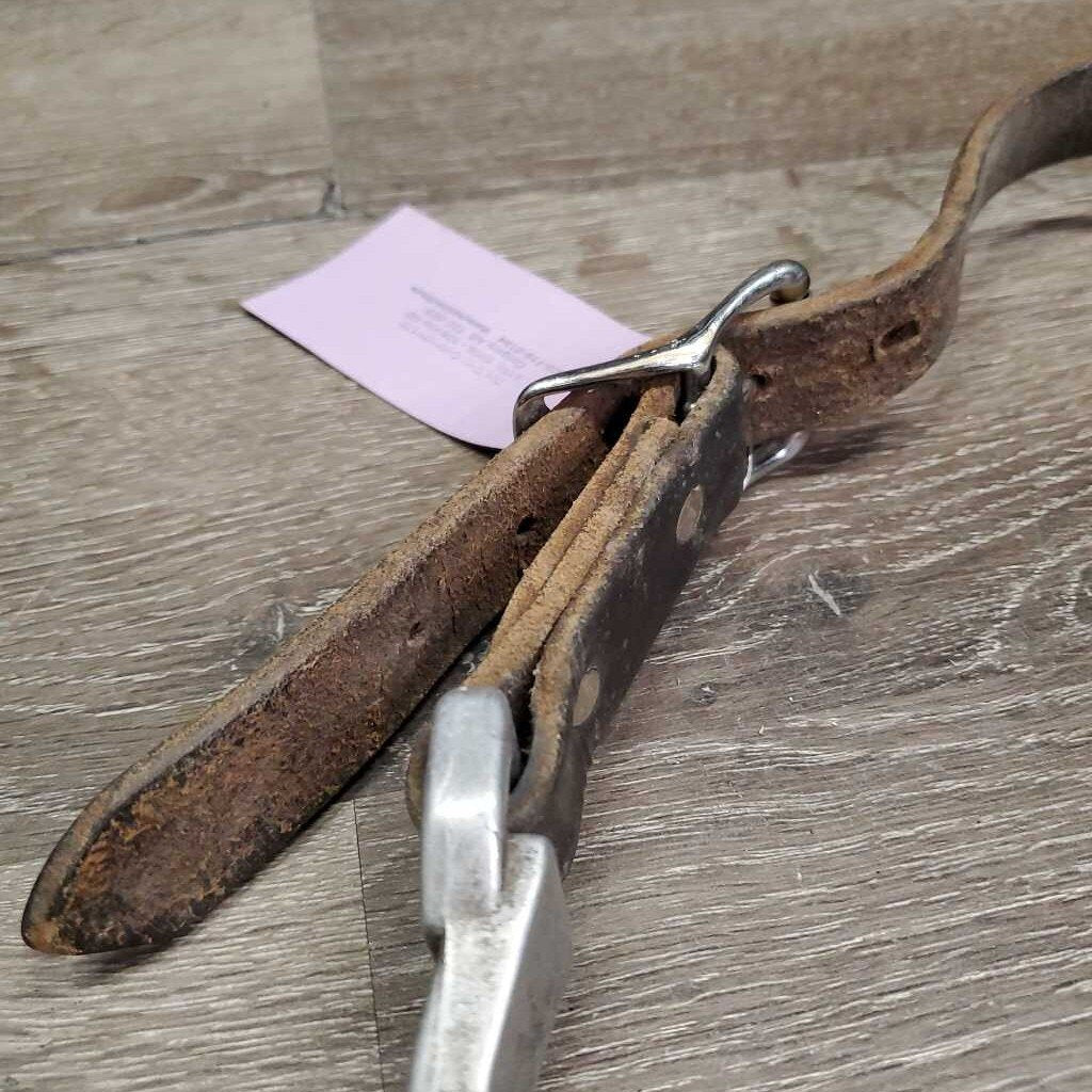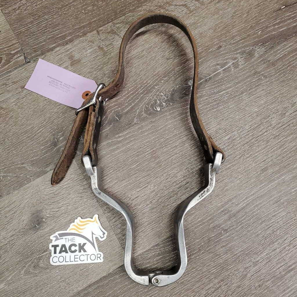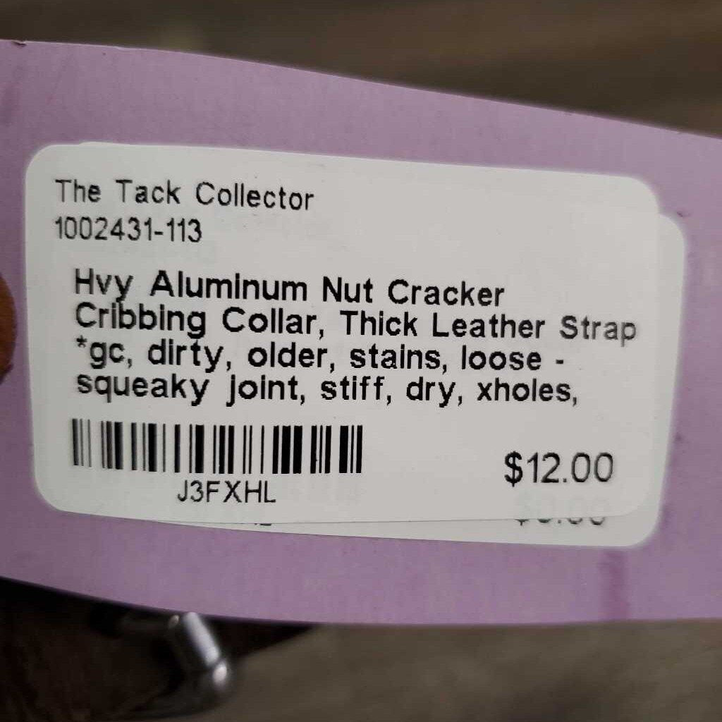 Hvy Aluminum Nut Cracker Cribbing Collar, Thick Leather Strap *gc, dirty, older, stains, loose - squeaky joint, stiff, dry, xholes, rubs, faded