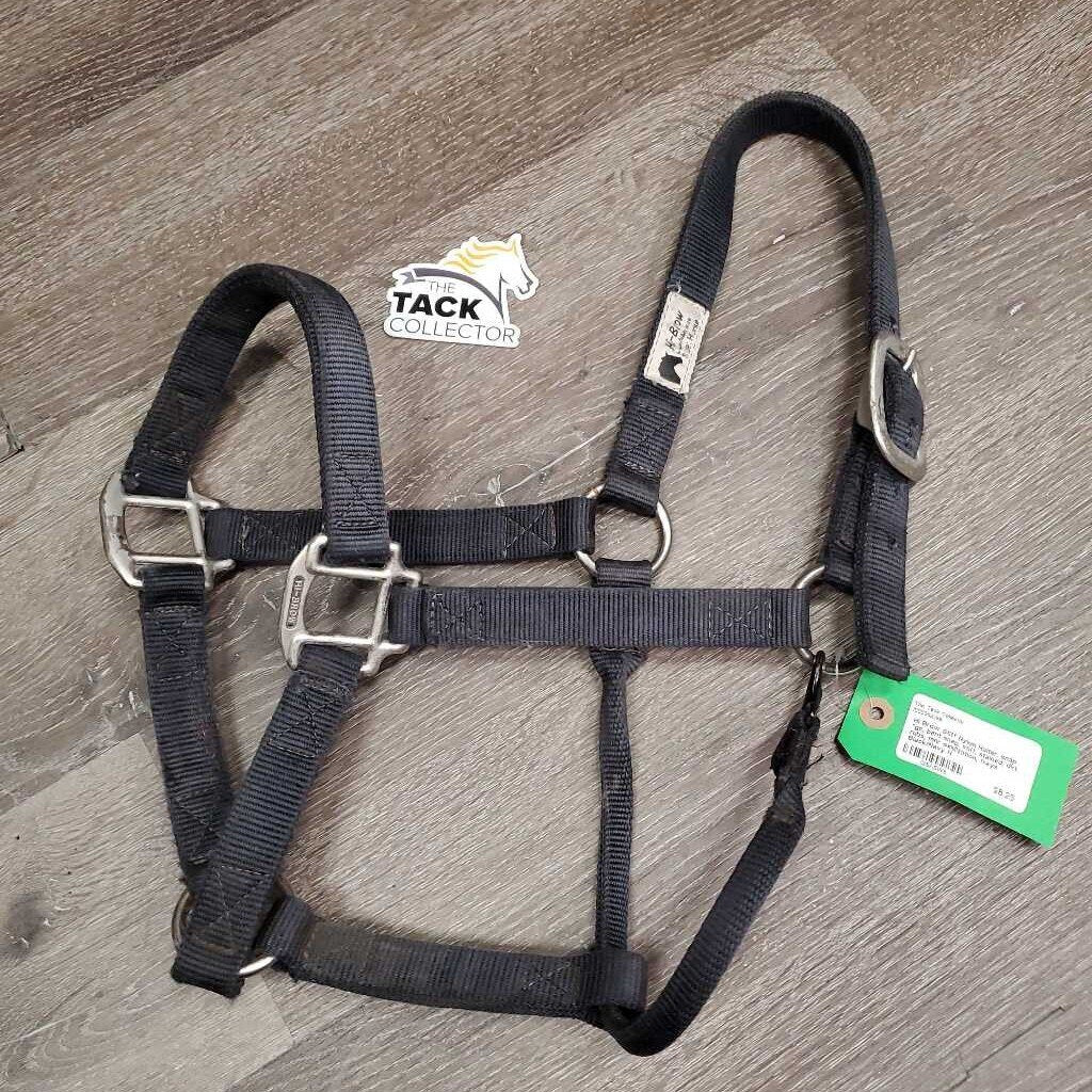Stiff Nylon Halter, snap *gc, bent snap, stiff, stained, dirt, rubs, mnr oxidization, frays