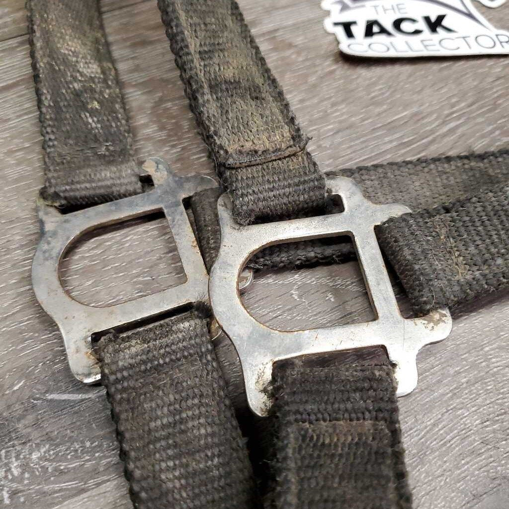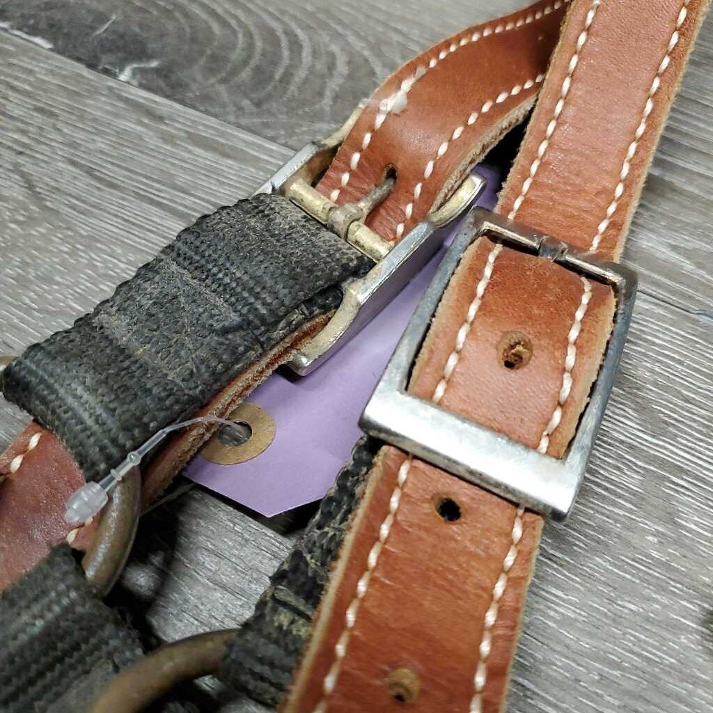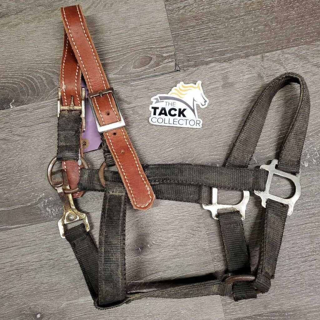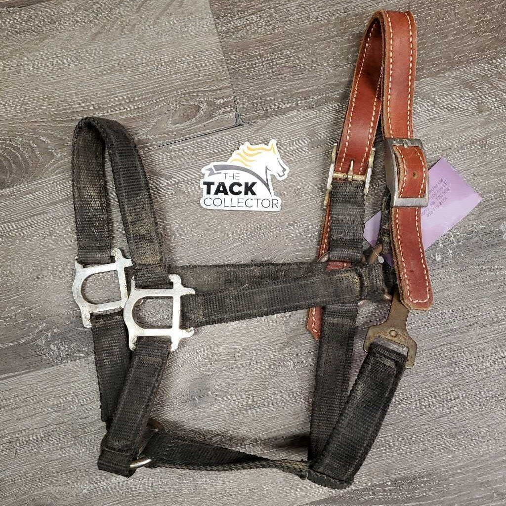 Stiff Nylon Halter, Thick Soft Leather Crown, spring snap *fair, dirty, edge rubs & snags, bent snap, rust, faded, like new crown