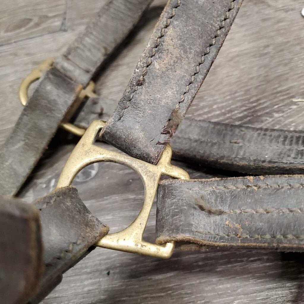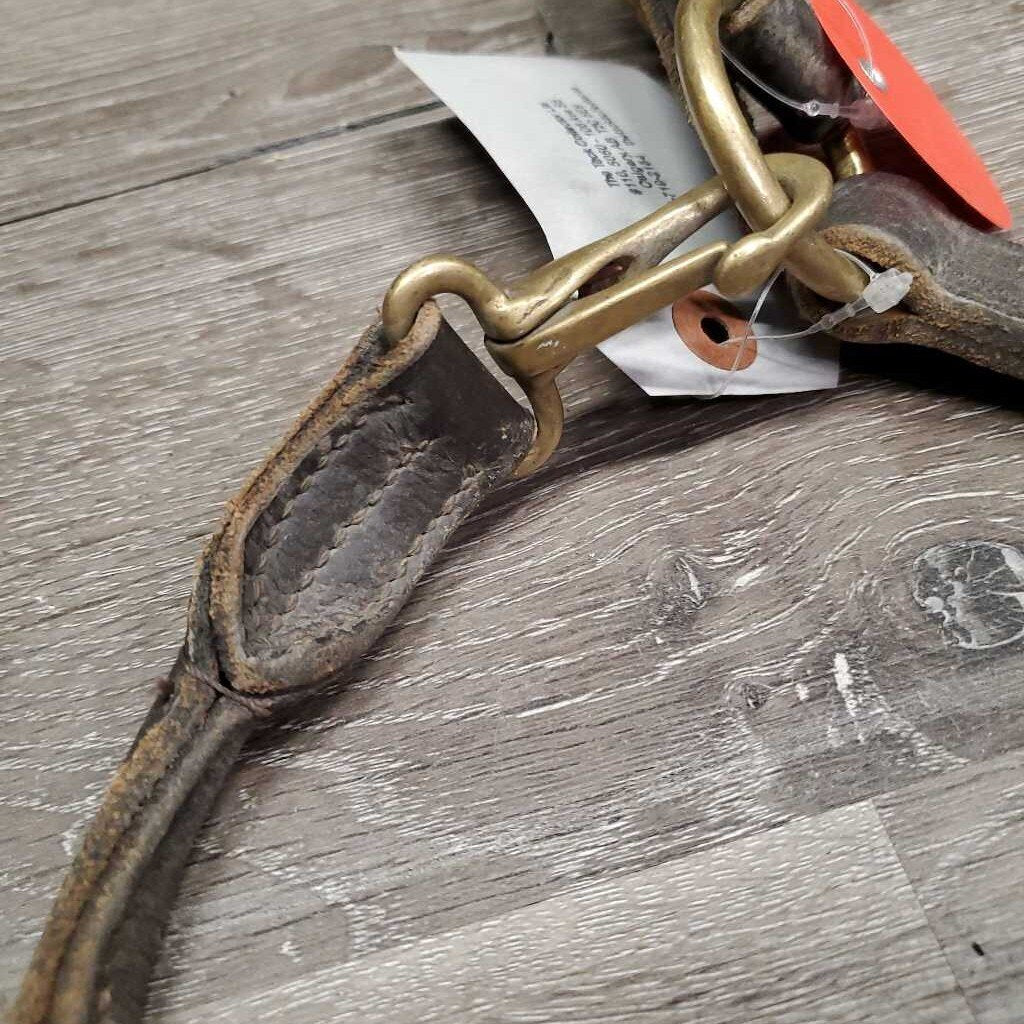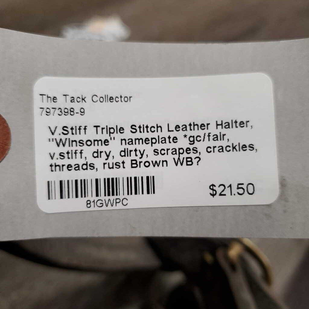 V.Stiff Triple Stitch Leather Halter, "Winsome" nameplate, adj, snap *gc/fair, v.stiff, dry, dirty, scrapes, crackles, threads, rust