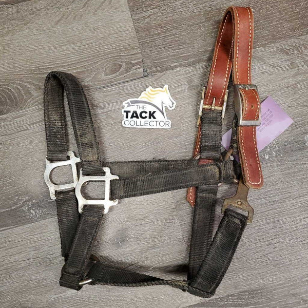 Thick Nylon Halter, adj, snap *vgc, clean, faded & discolored, stains, mnr stretched holes, scraped hardware Weaver Size: Foal - Mini $12.75