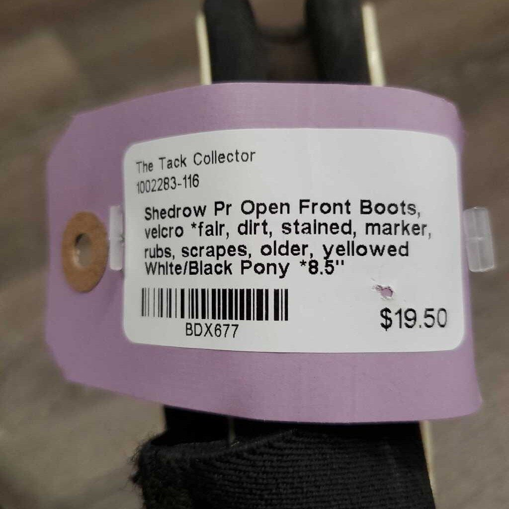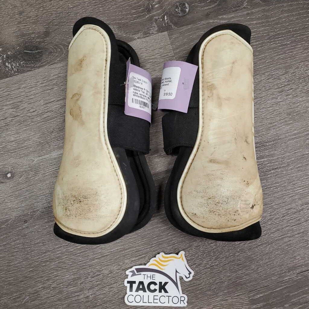 Pr Open Front Boots, velcro *fair, dirt, stained, marker, rubs, scrapes, older, yellowed