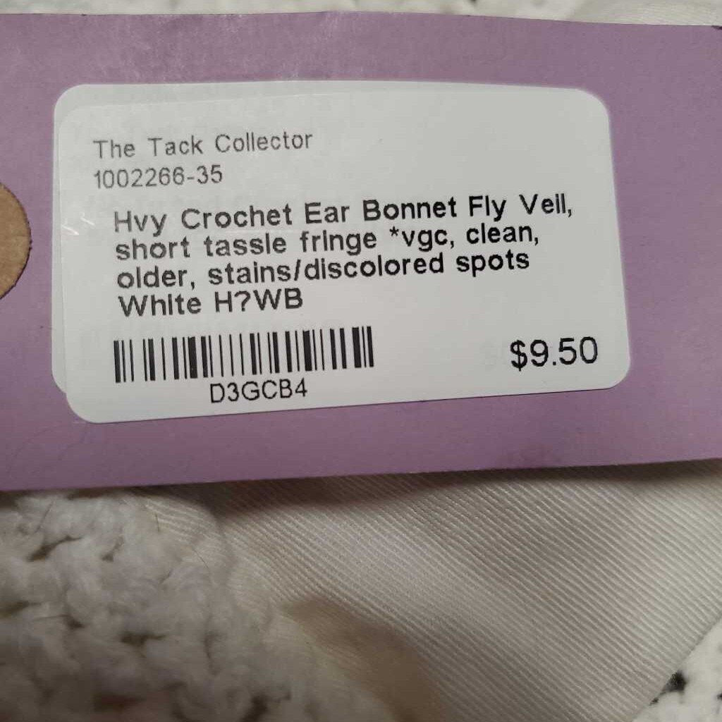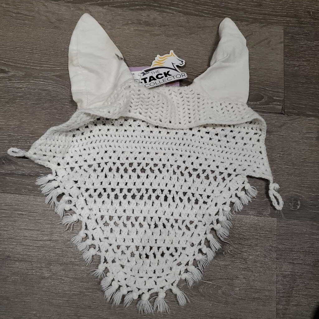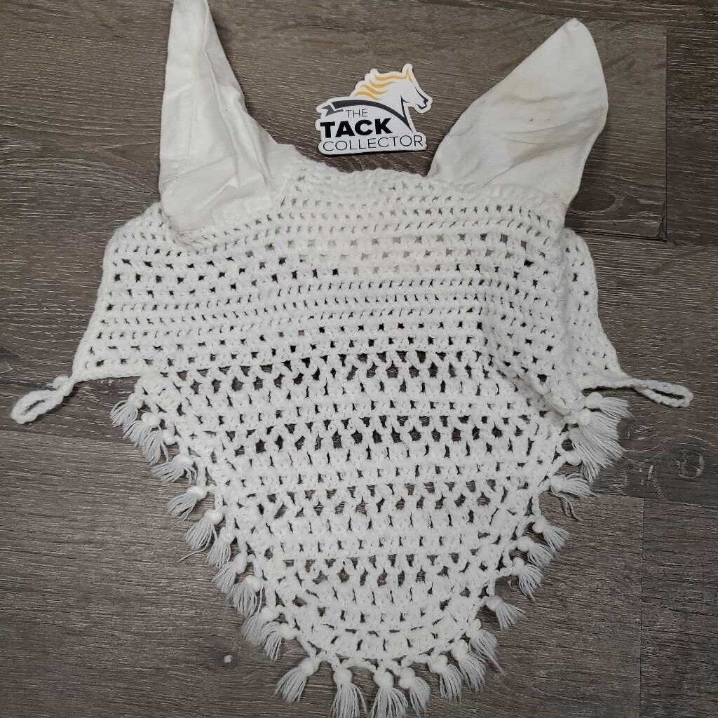 Hvy Crochet Ear Bonnet Fly Veil, short tassle fringe *vgc, clean, older, stains/discolored spots