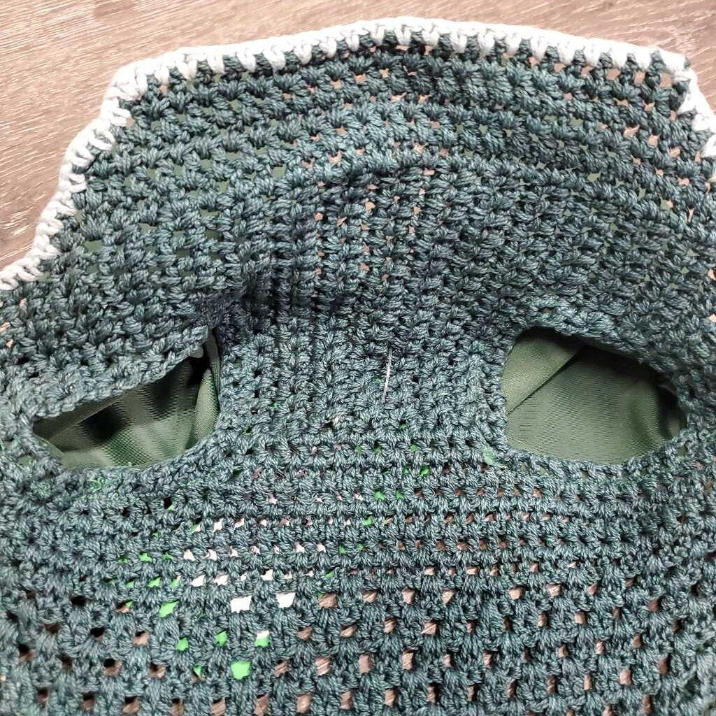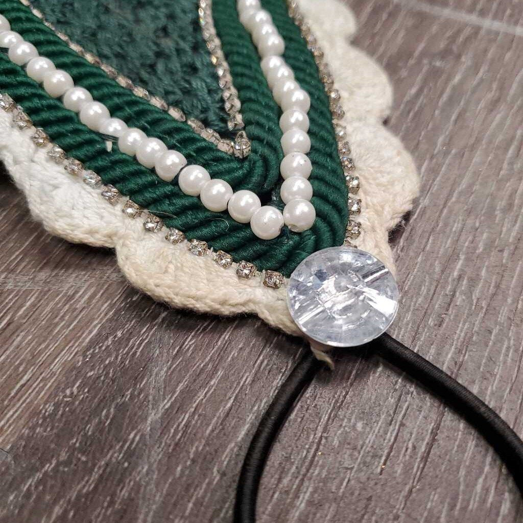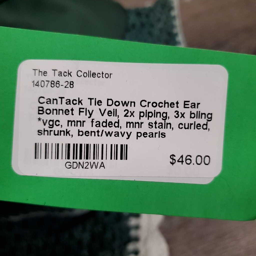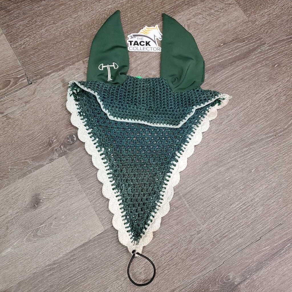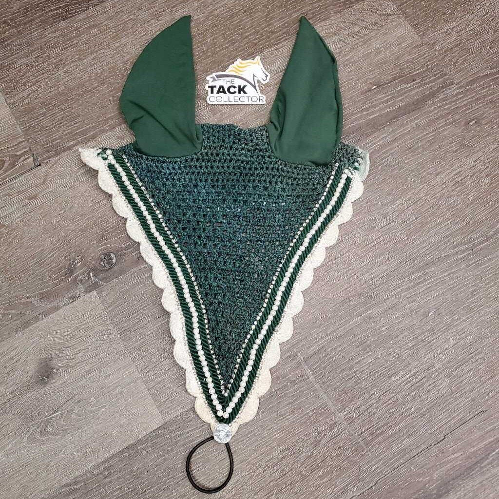 Tie Down Crochet Ear Bonnet Fly Veil, 2x piping, 3x bling *vgc, mnr faded, mnr stain, curled, shrunk, bent/wavy pearls