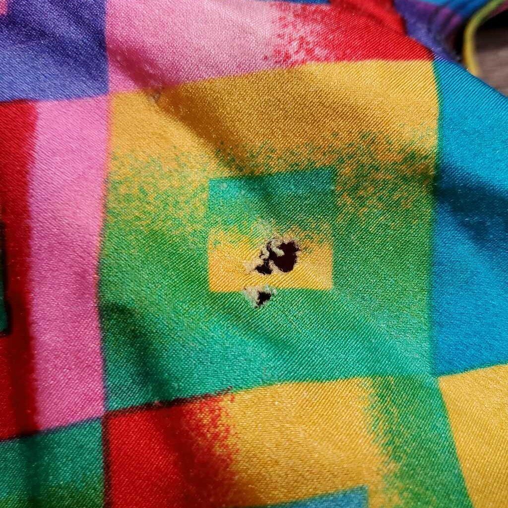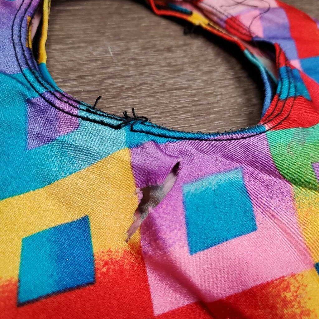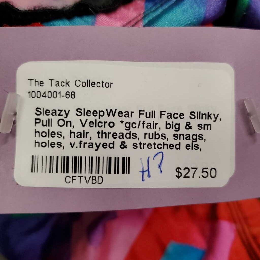 Full Face Slinky, Pull On, Velcro *gc/fair, big & sm holes, hair, threads, rubs, snags, holes, v.frayed & stretched els, unstitched eyes