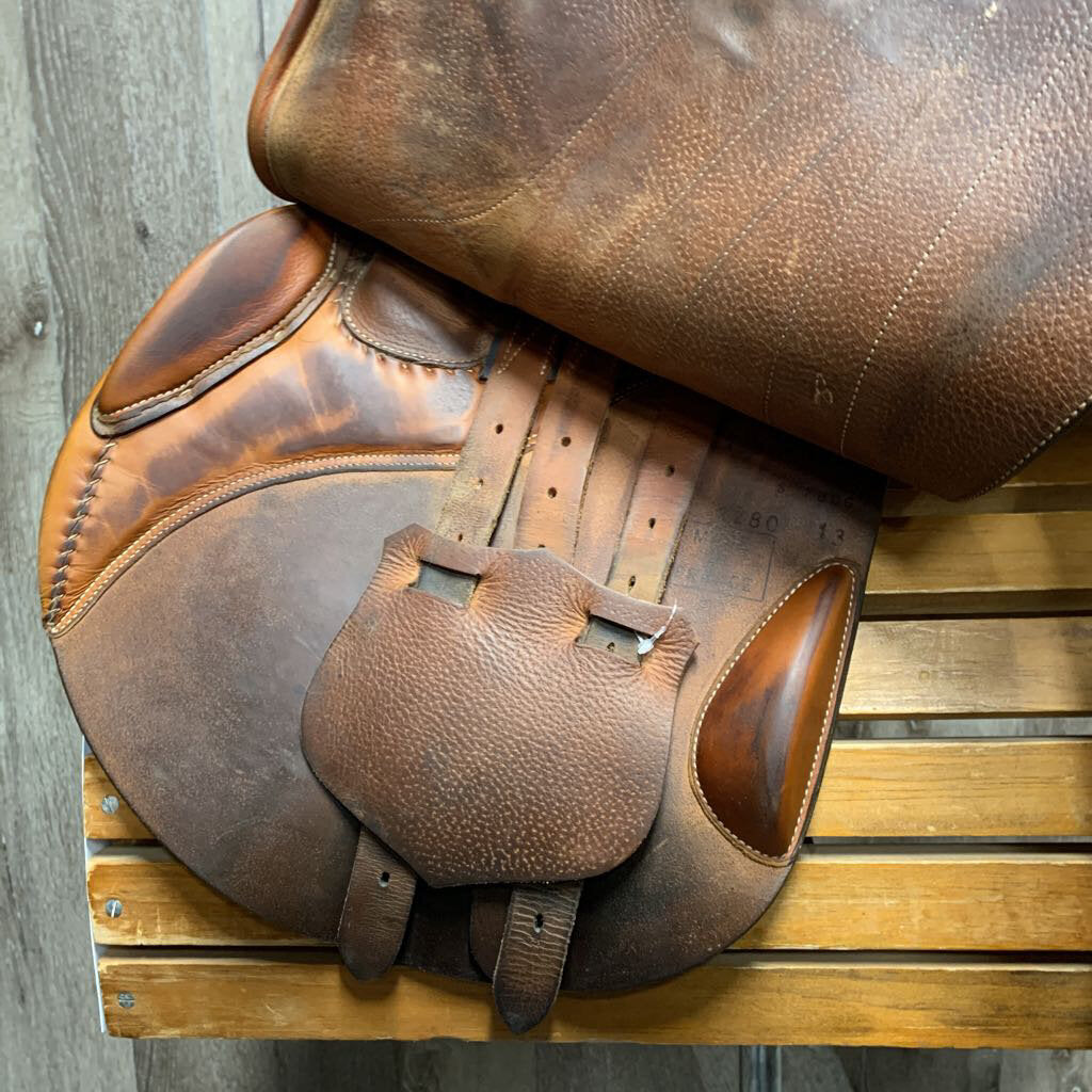 VGC wear described as: Pommel: seam rubs/tabs Twist: seam rubs, mnr stain Seat: seam rubs, stain Cantle: rubs, scrape, stain Skirt: rubs Flaps: Top: rubs, stains, bubbles Underside & Bottom: dents, rubs, stains Panels: stains, rubs, scrapes, film, saddle pad marks Gullet:scrapes