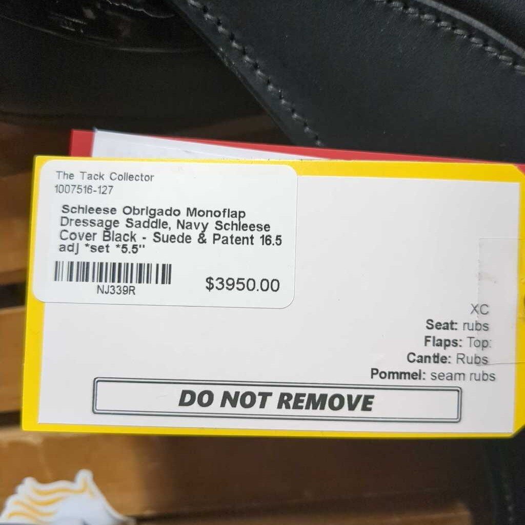 16.5 adj *set *5.5" Schleese Obrigado Monoflap Dressage Saddle, Navy Schleese Cover, Wool Flocking, Shoulder Relief Panels, Rear Gusset Panels, Lg External Front Blocks, Flaps: 16"L x 10"W Serial #: O-SHW B2 16.5 M05835S0324