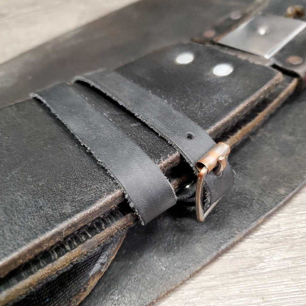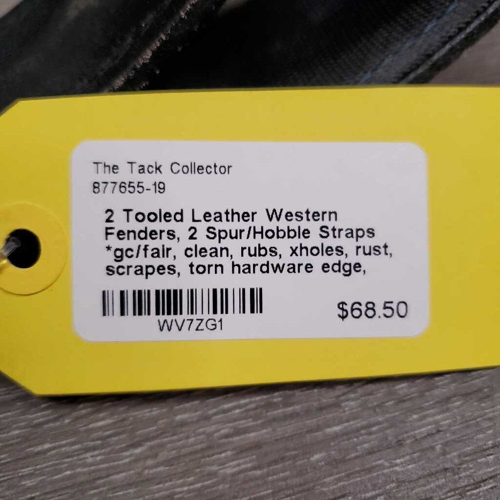 2 Tooled Leather Western Fenders, 2 Spur/Hobble Straps *gc/fair, clean, rubs, xholes, rust, scrapes, torn hardware edge, v.rough edges