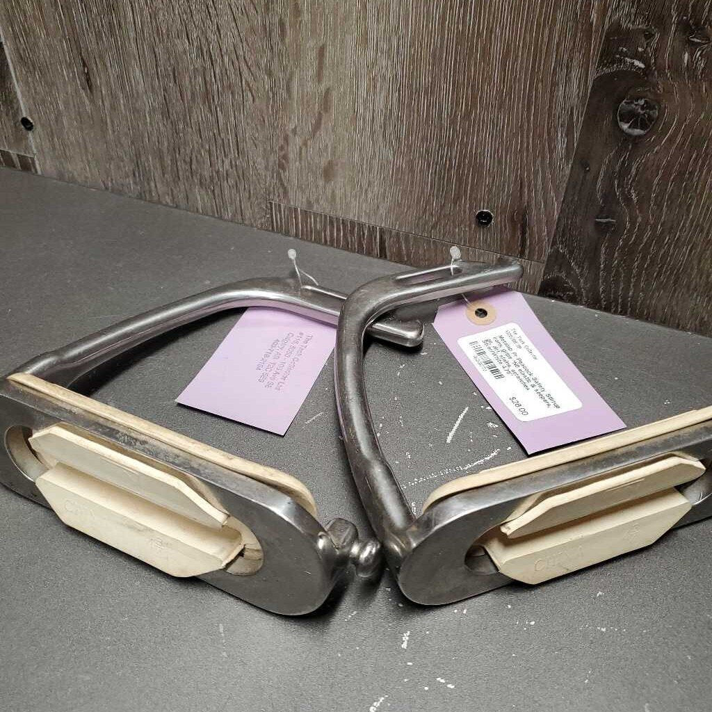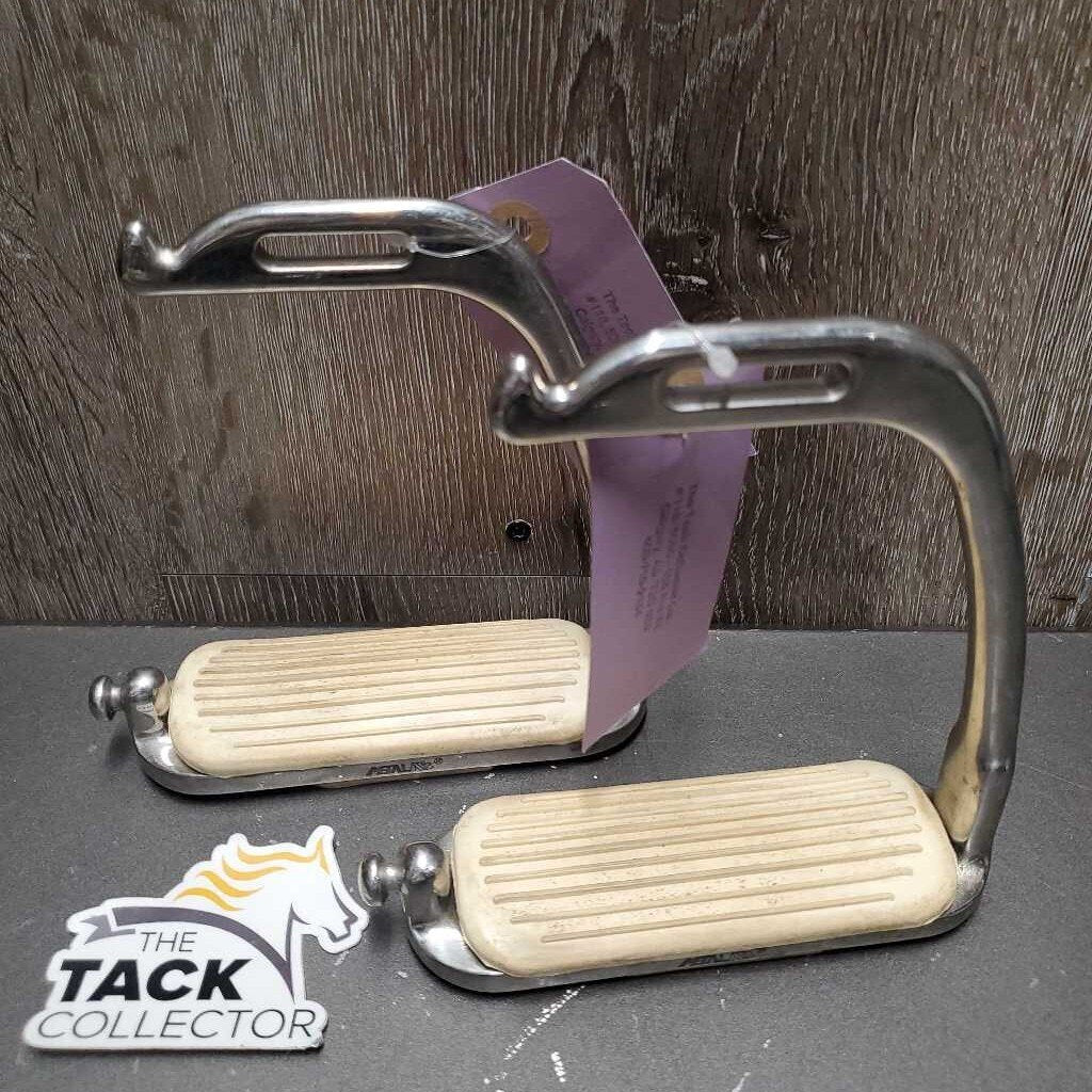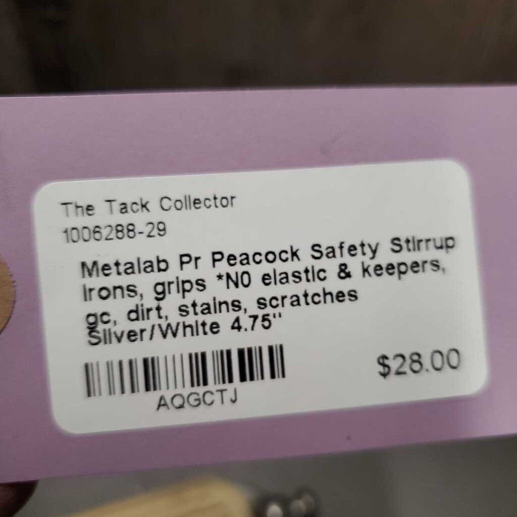 Hvy Peacock Safety Stirrup Irons, grips *N0 elastic & keepers, gc, dirt, stains, scratches