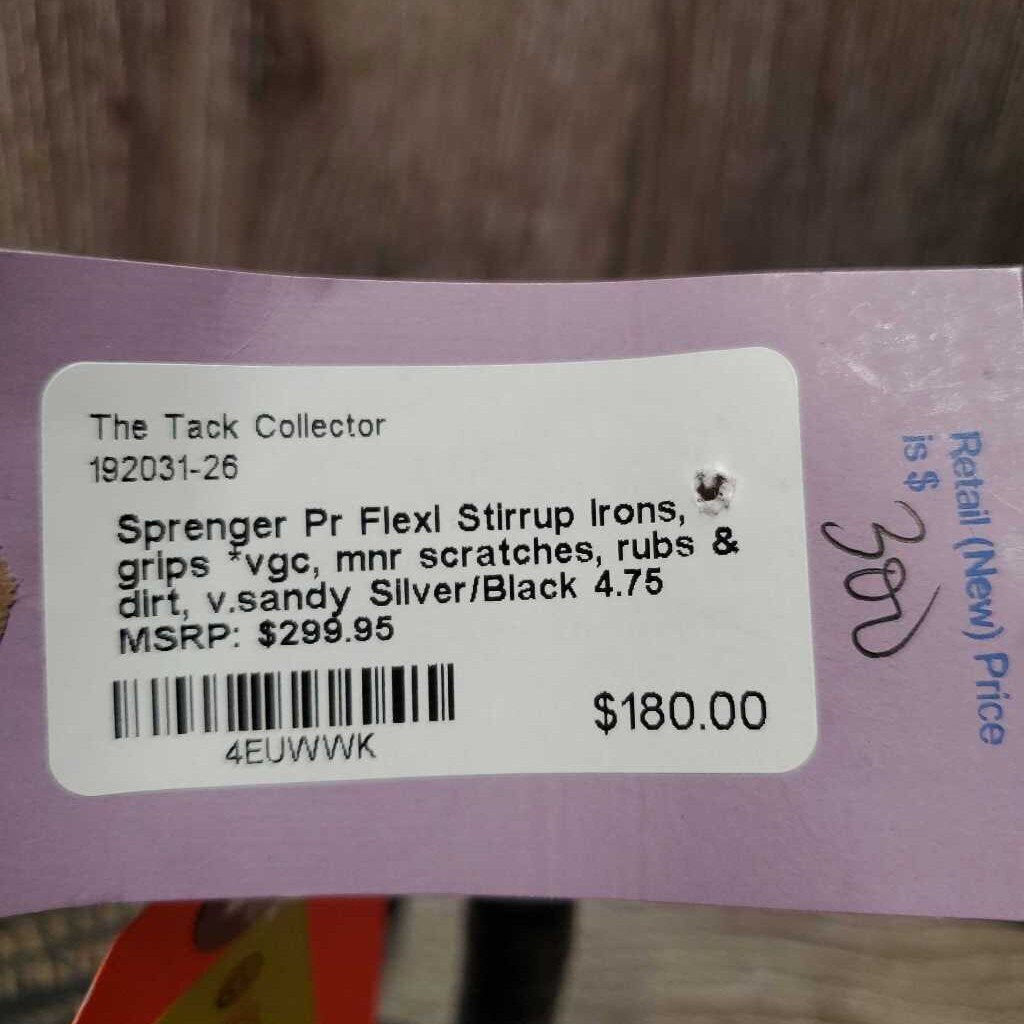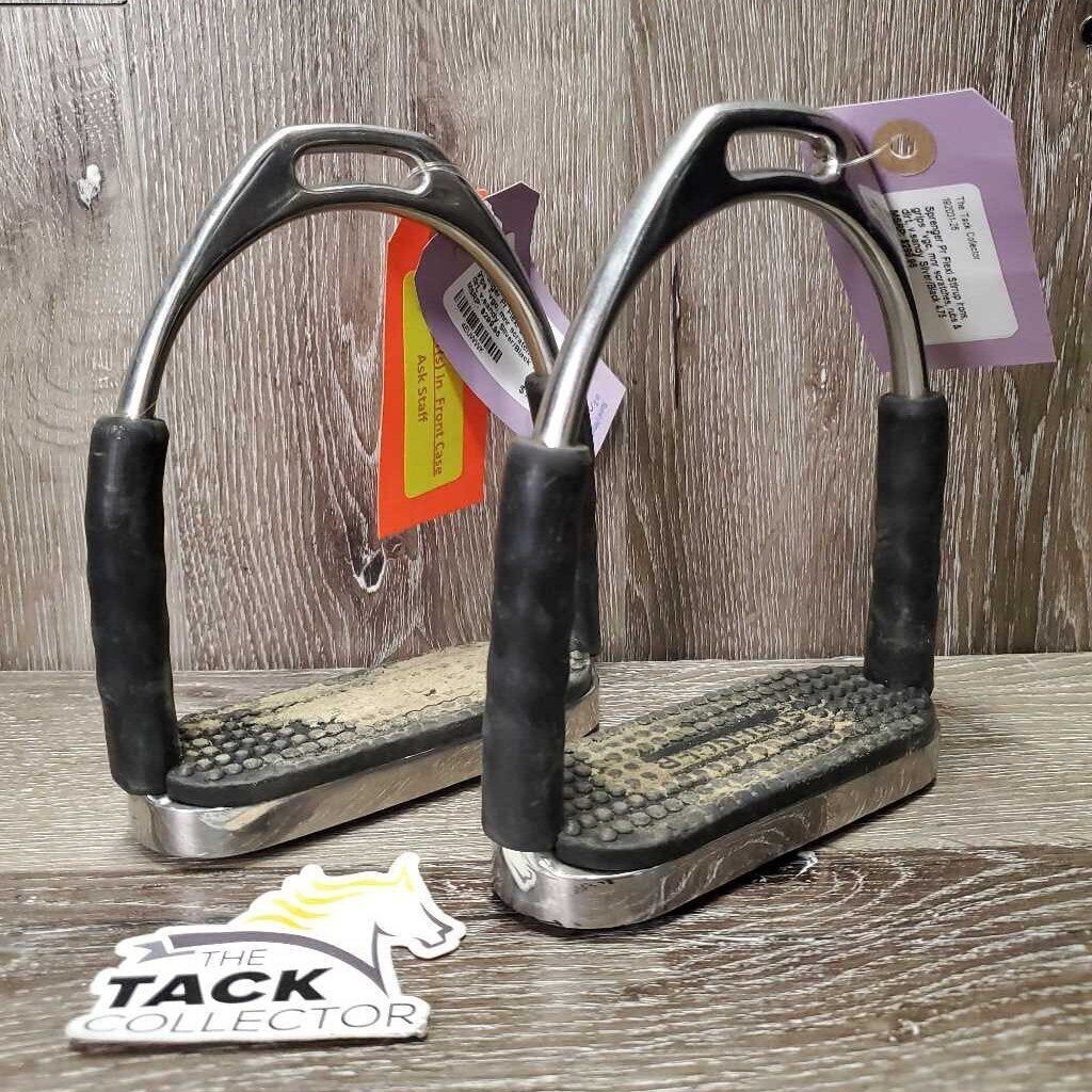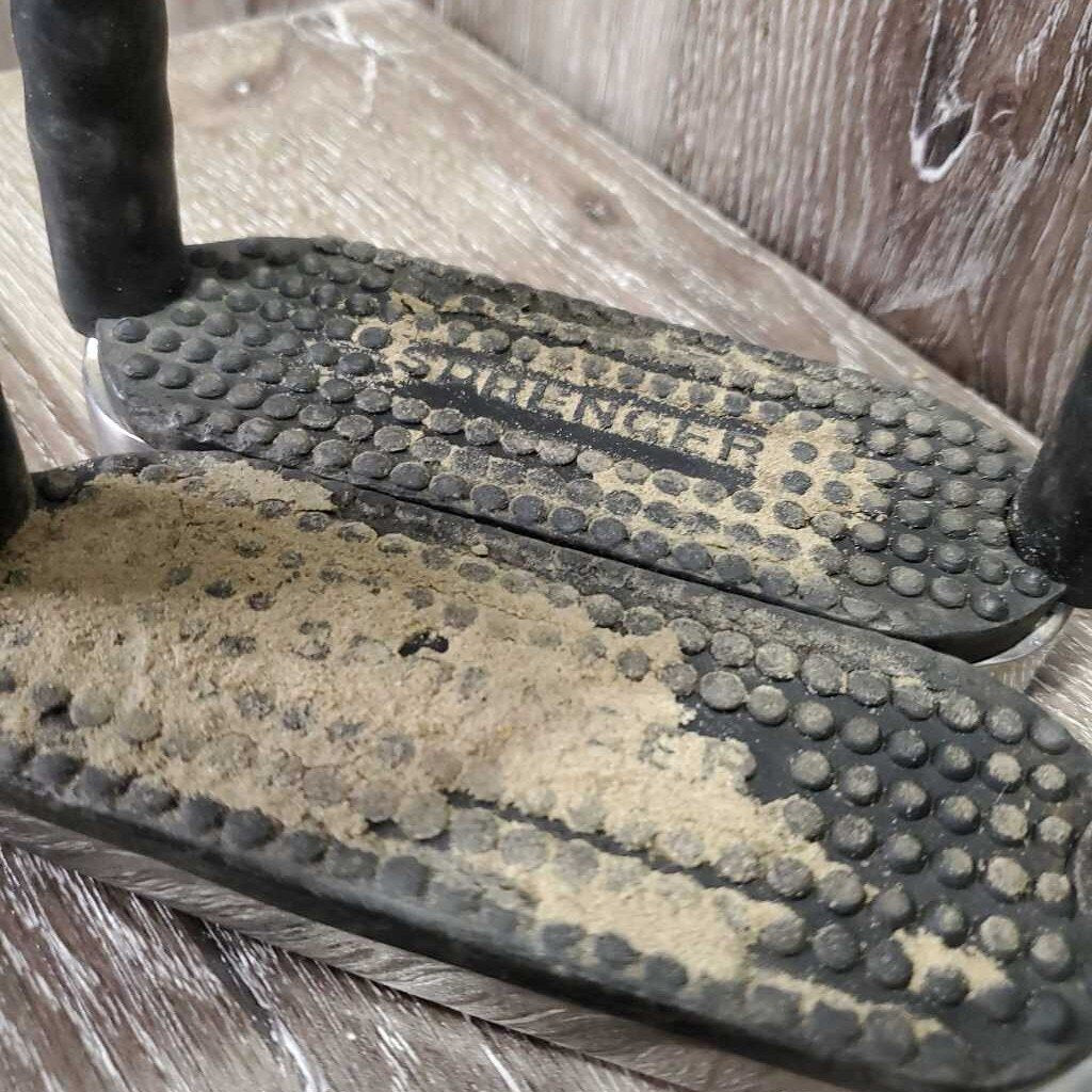 Pr Flexi Stirrup Irons, grips *vgc, mnr scratches, rubs & dirt, v.sandy