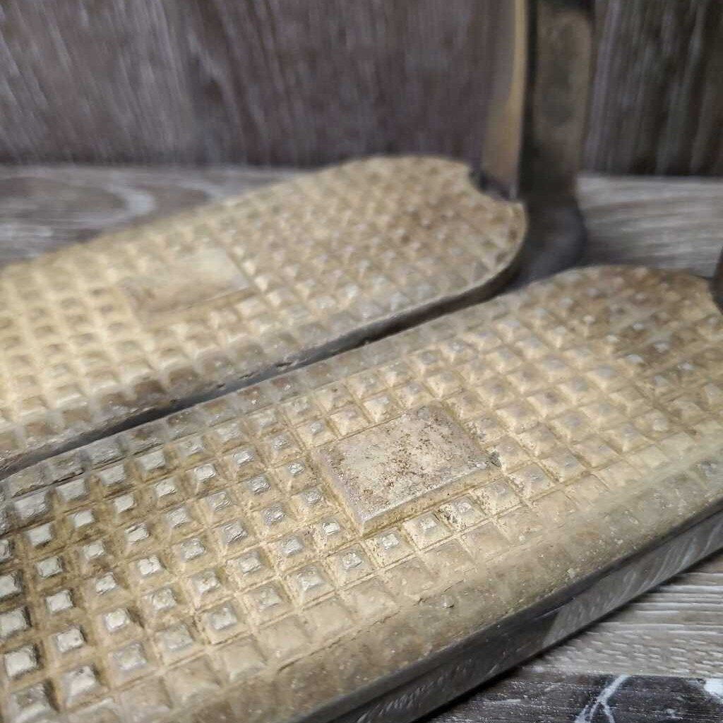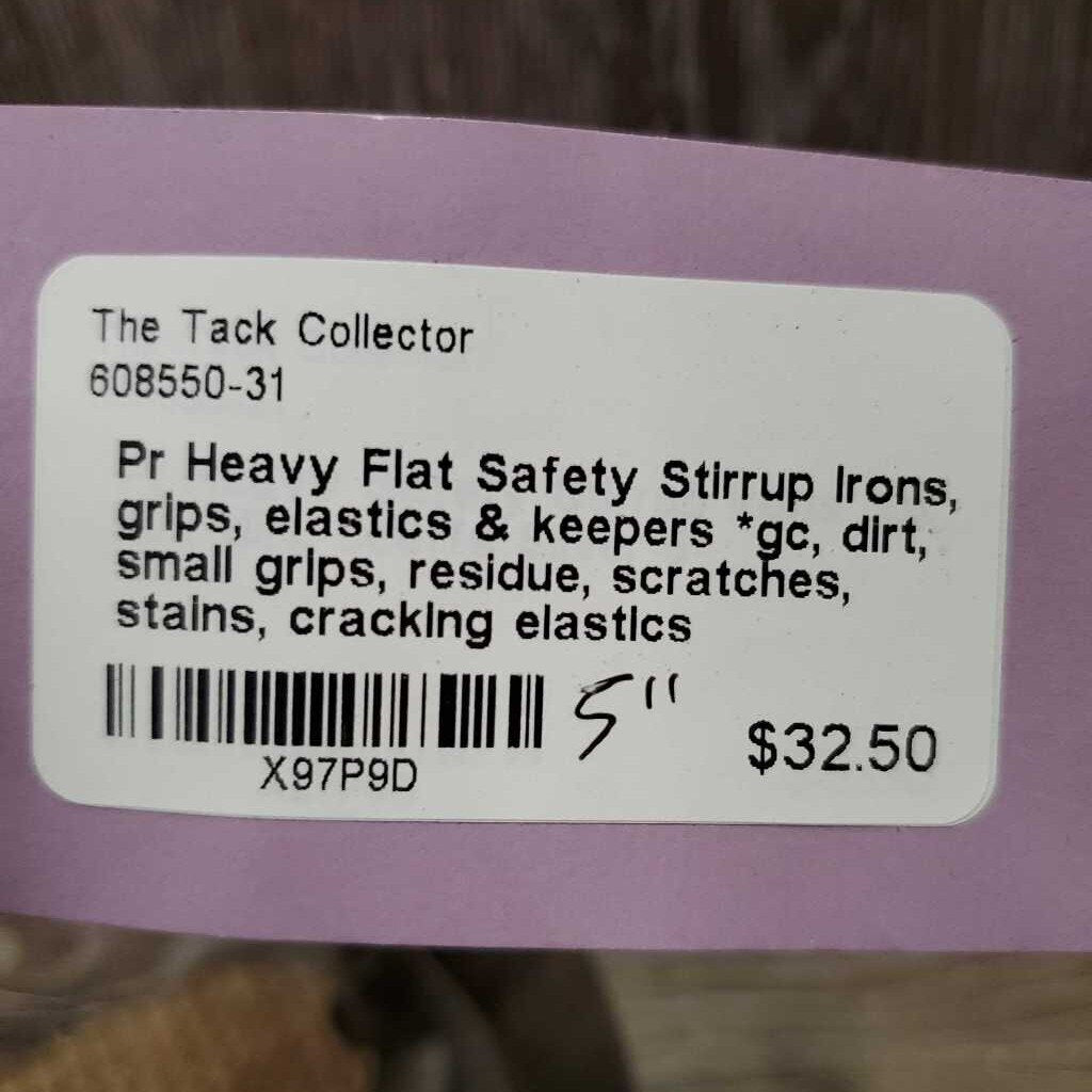 Pr Heavy Flat Safety Stirrup Irons, grips, elastics & keepers *gc, dirt, small grips, residue, scratches, stains, cracking elastics
